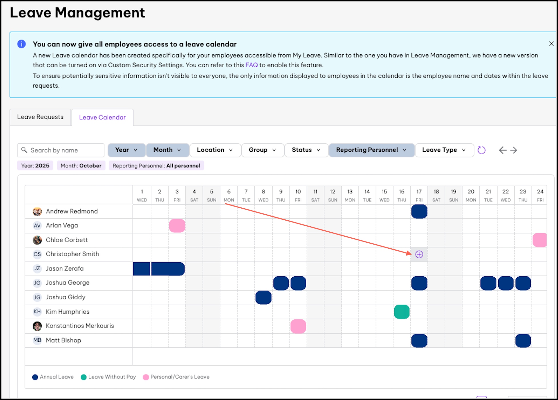 - Annual Leave: This will be the current leave balance as at the latest pay run. Leave balances will only update when payslips are imported from your Payroll platform.
