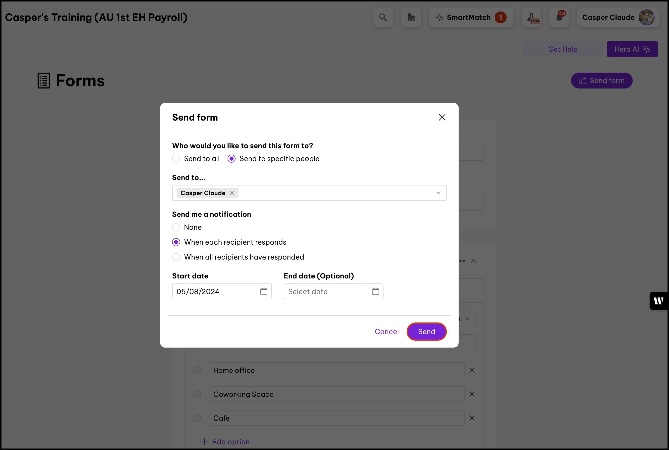 - Specific employee(s): Select individual employees, groups, or locations. Only employees with permission to access the form will appear in the list.
