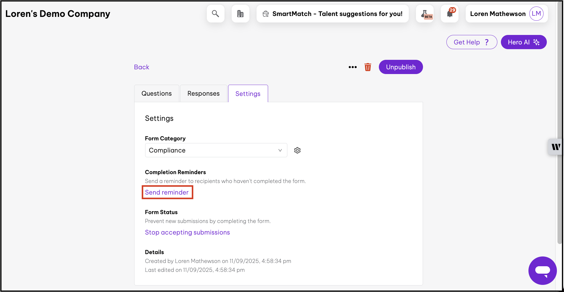 - Click the Unpublish button to unpublish the form.
