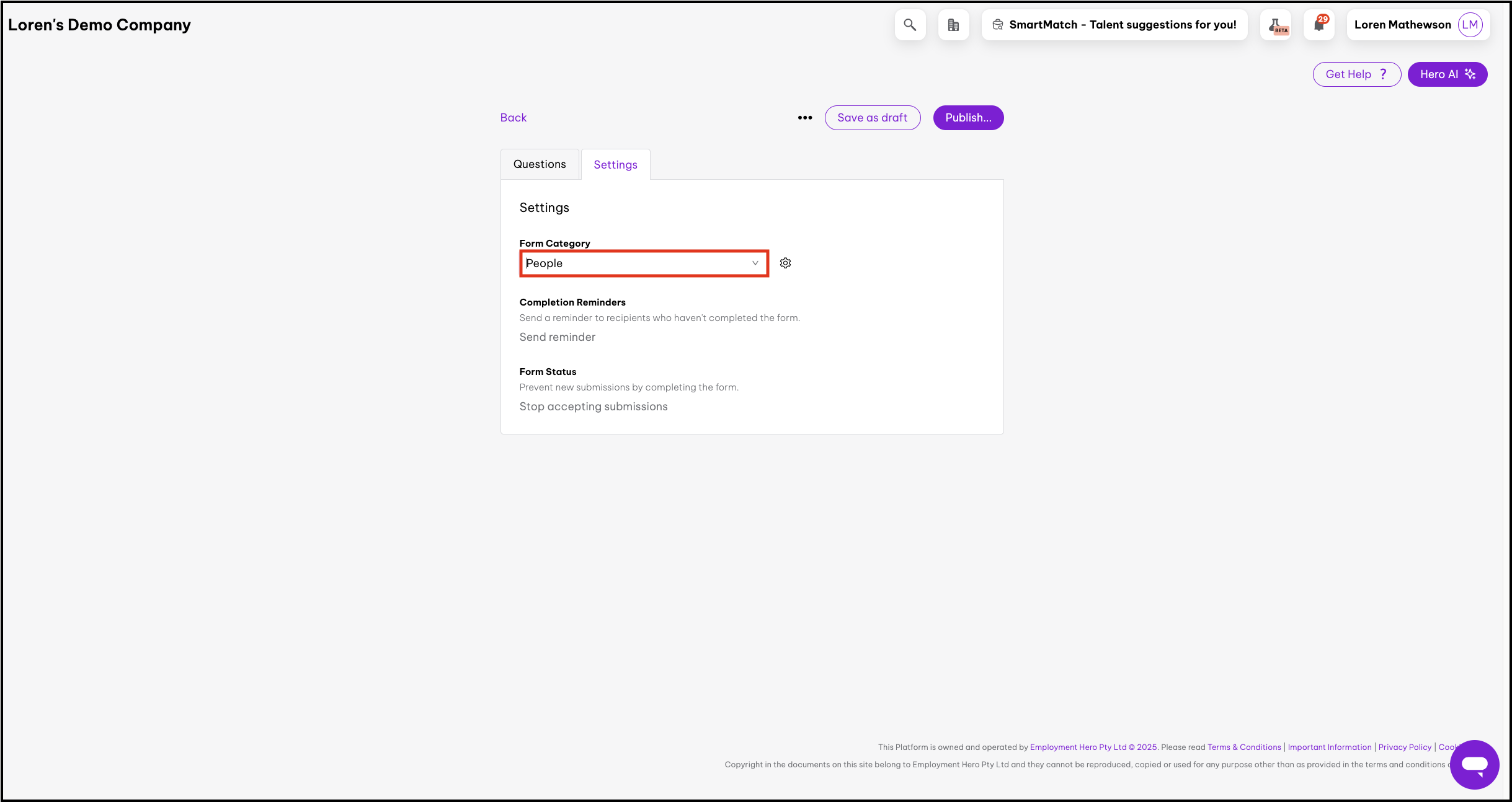Publishing a form makes it available in the Company Forms library for employees to access. Publishing does not automatically create tasks or send notifications—to request employees complete a form, you need to assign it separately.