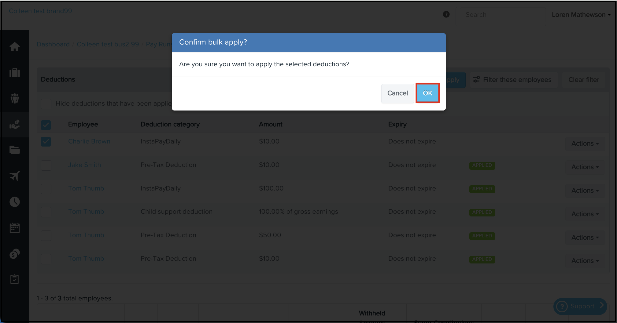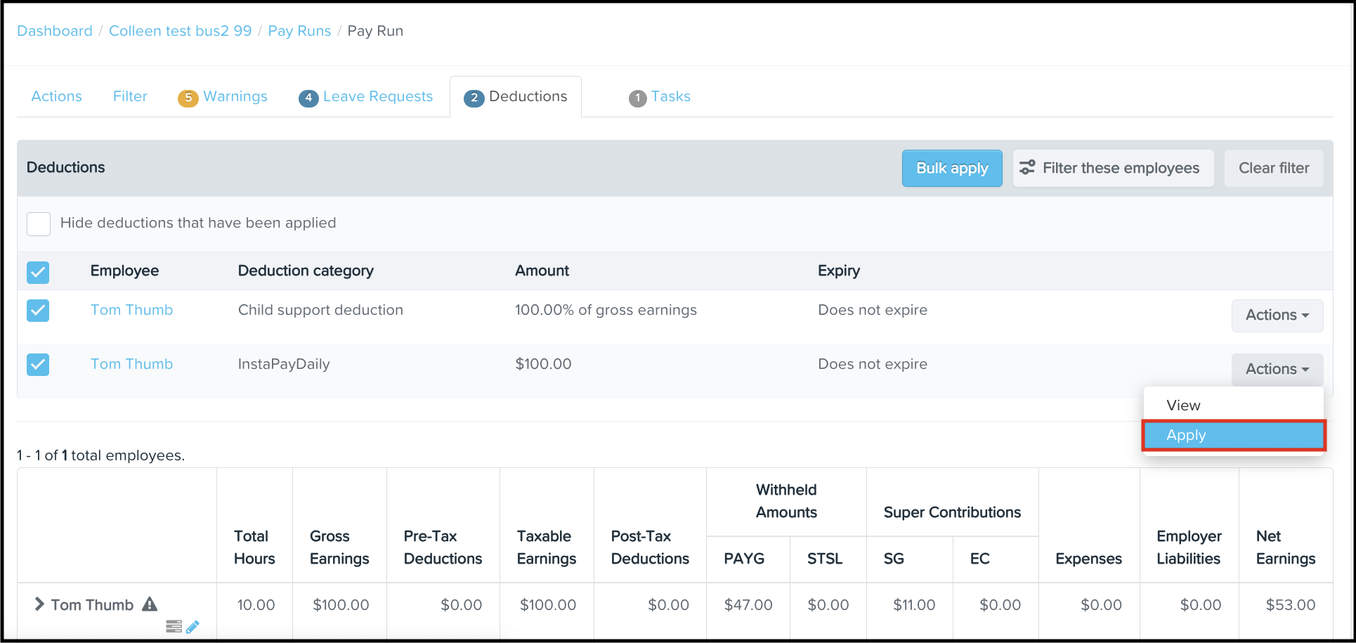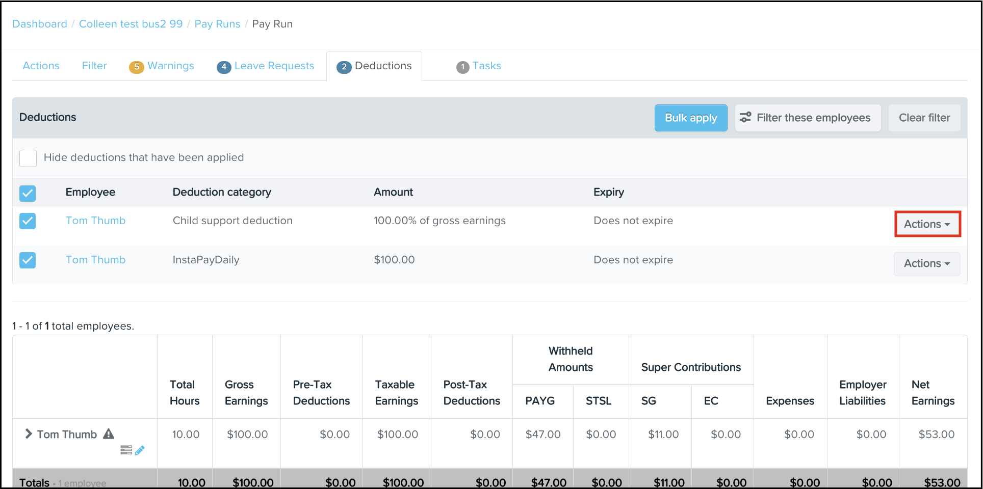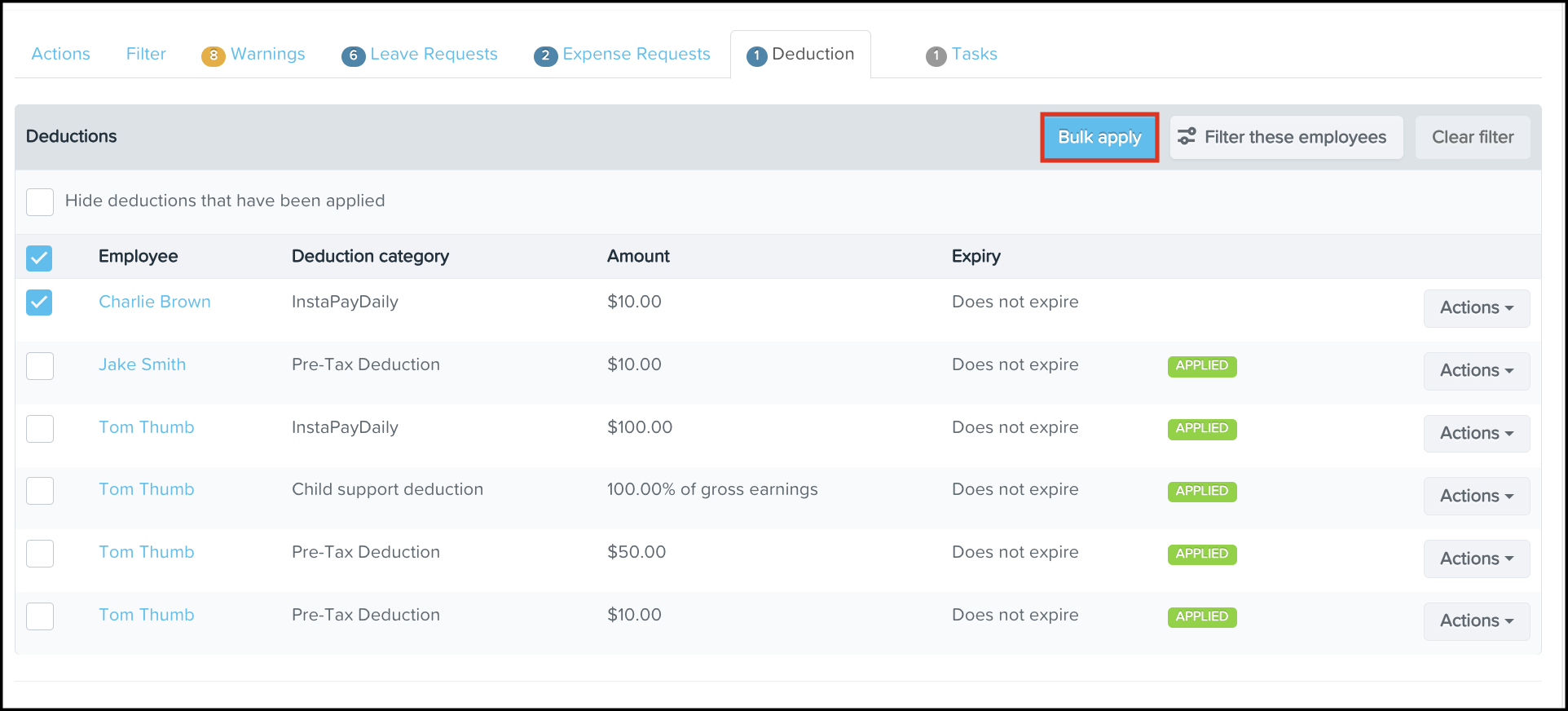 - Click on Actions on the employee to whom you would like to apply a deduction.