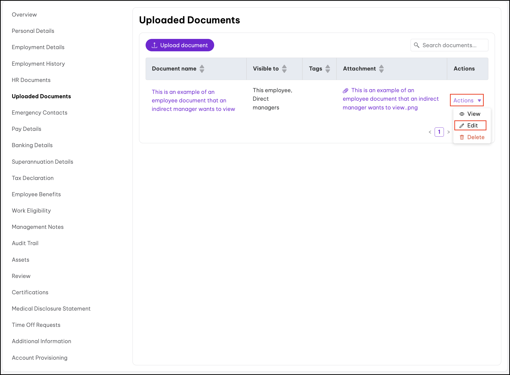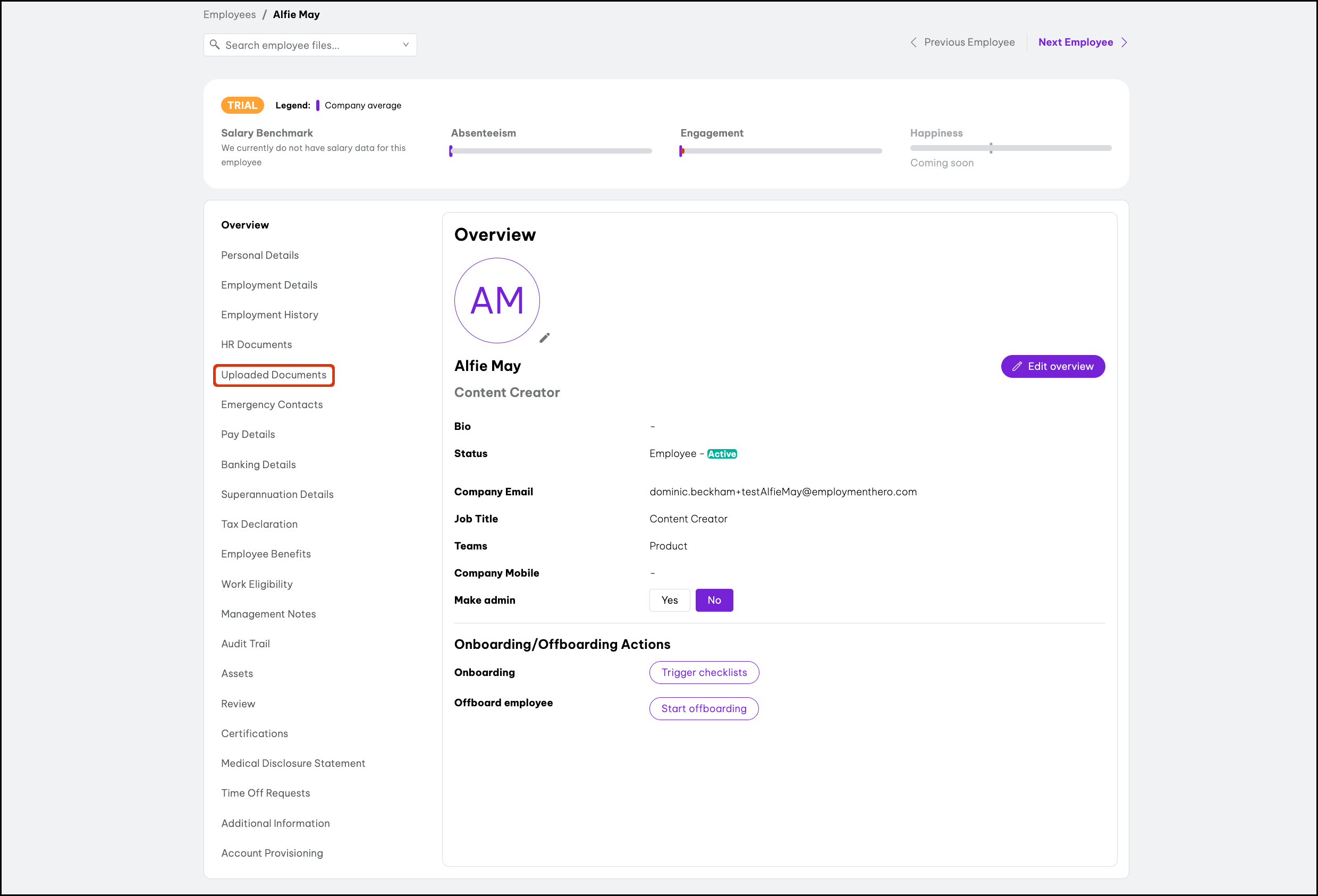 - From the Overview menu to the left of the selected employee's details, click Uploaded Documents.