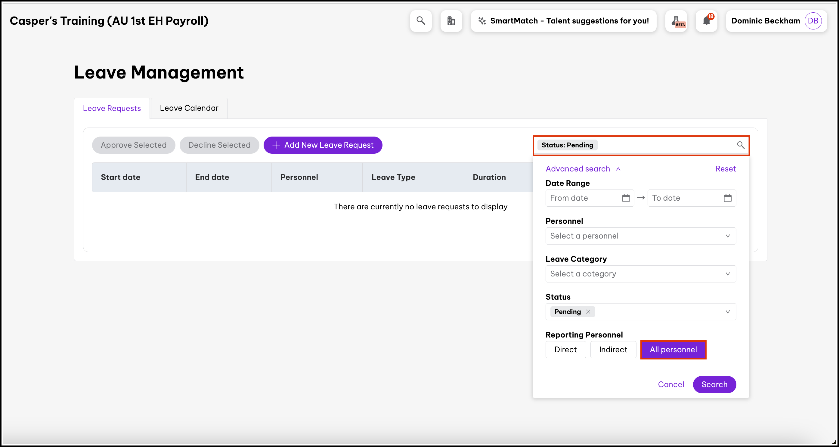 When searching for an employee's leave request on the Leave Management page, only direct reports will show up initially. You can use the filters to find other leave requests. For employees with no manager, you must ensure the Reporting personnel filter is set to All personnel.