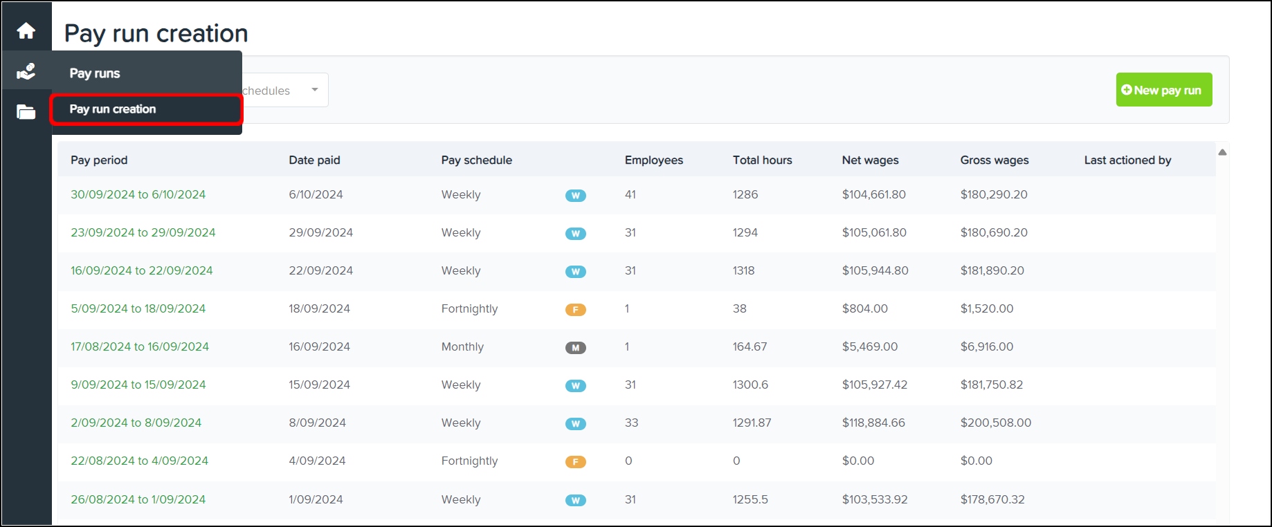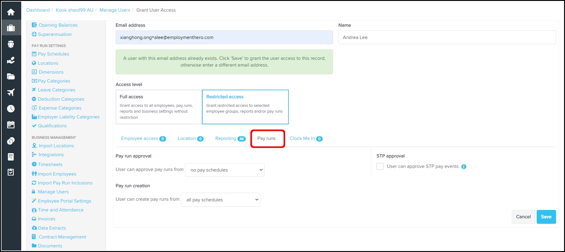 Pay run creation access allows you to nominate one or more restricted users that can create pay runs for specified pay schedules.