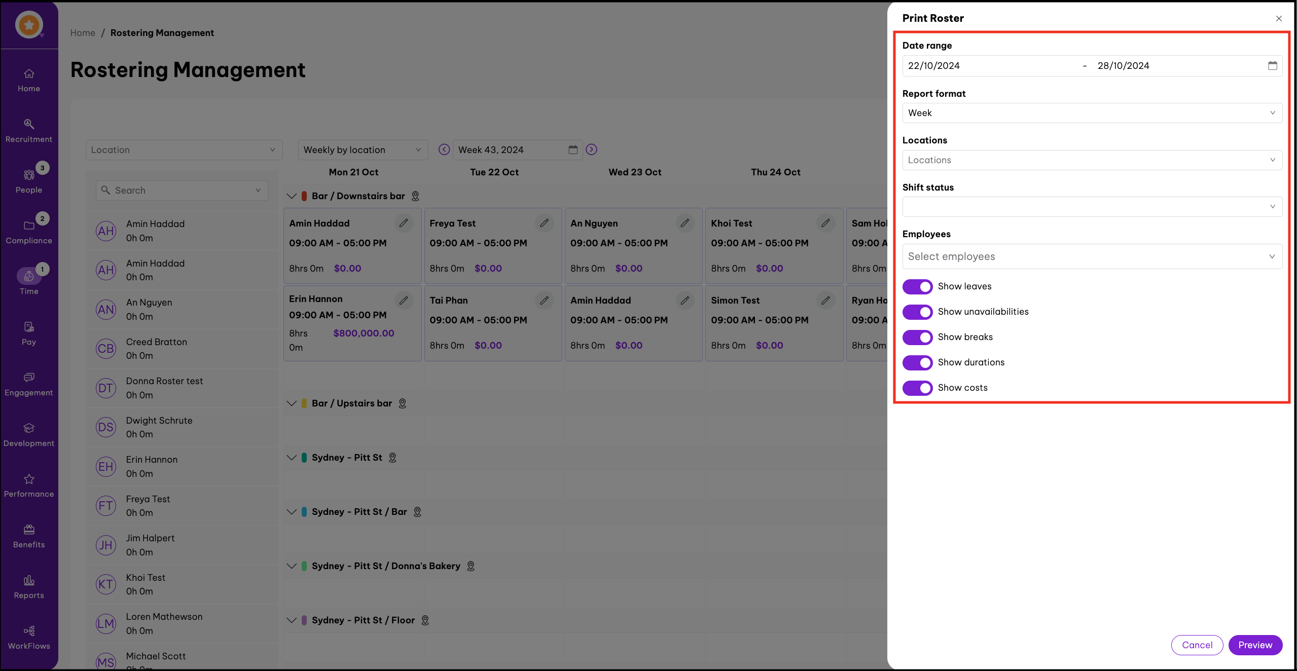 - Create a roster reportAdmins and managers can filter, view and download the rostering report in the reports module on the platform.