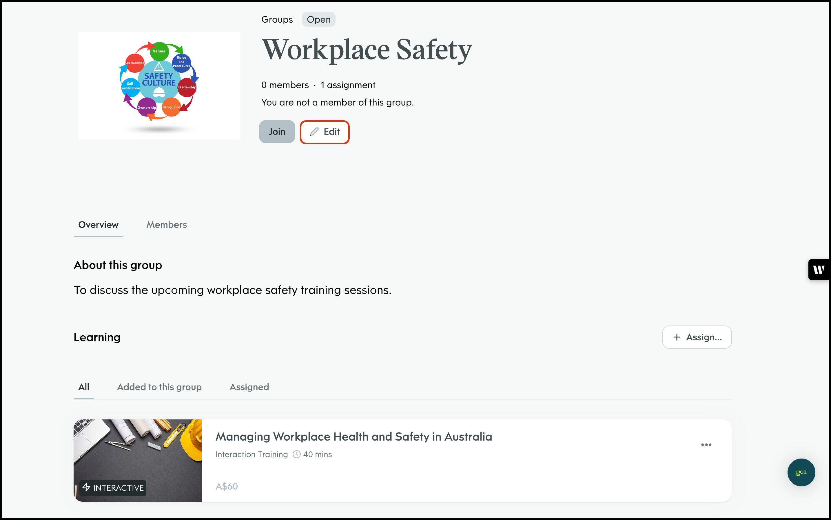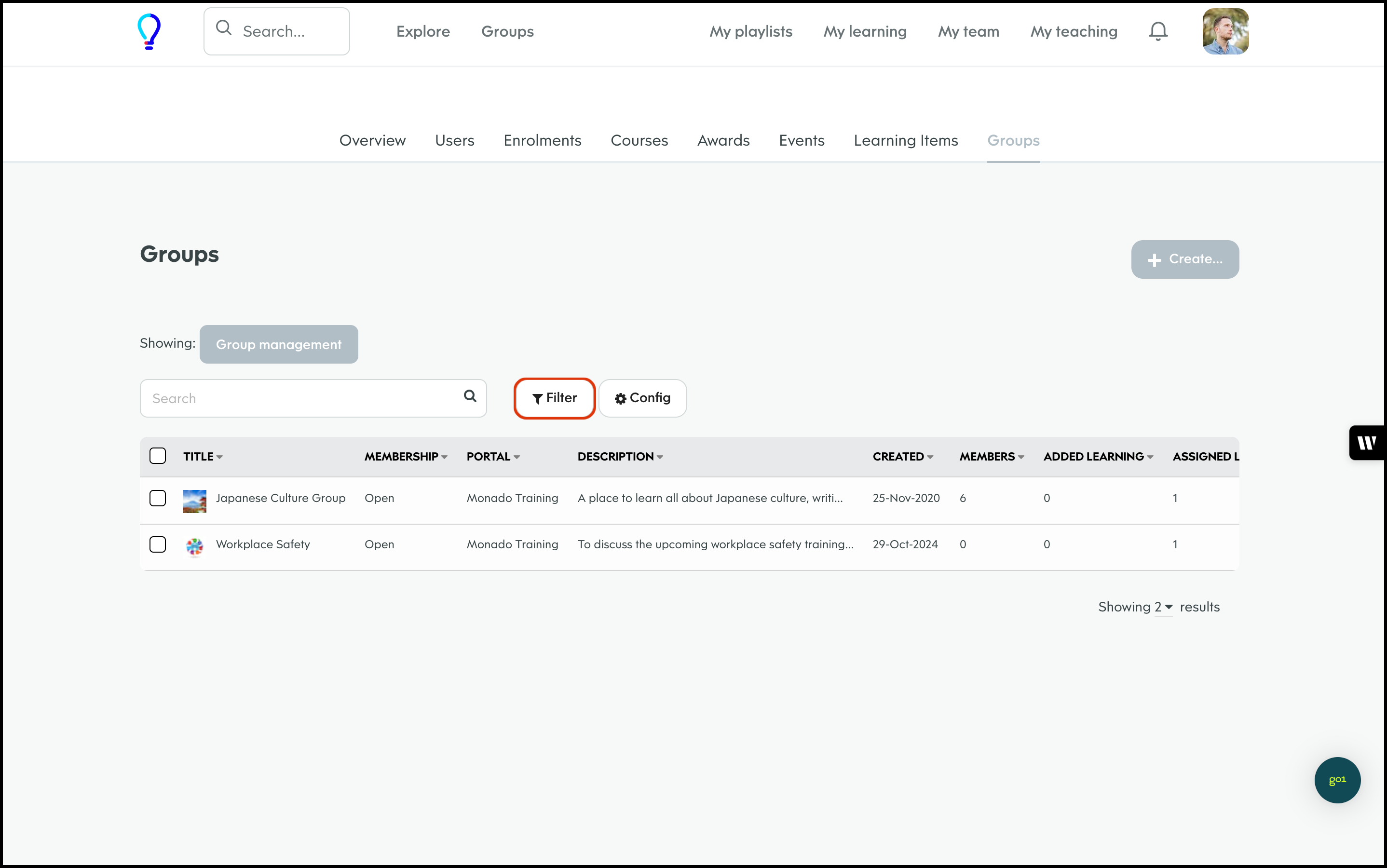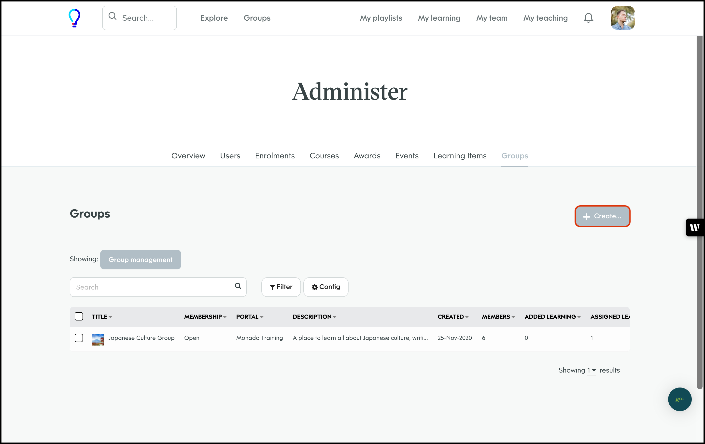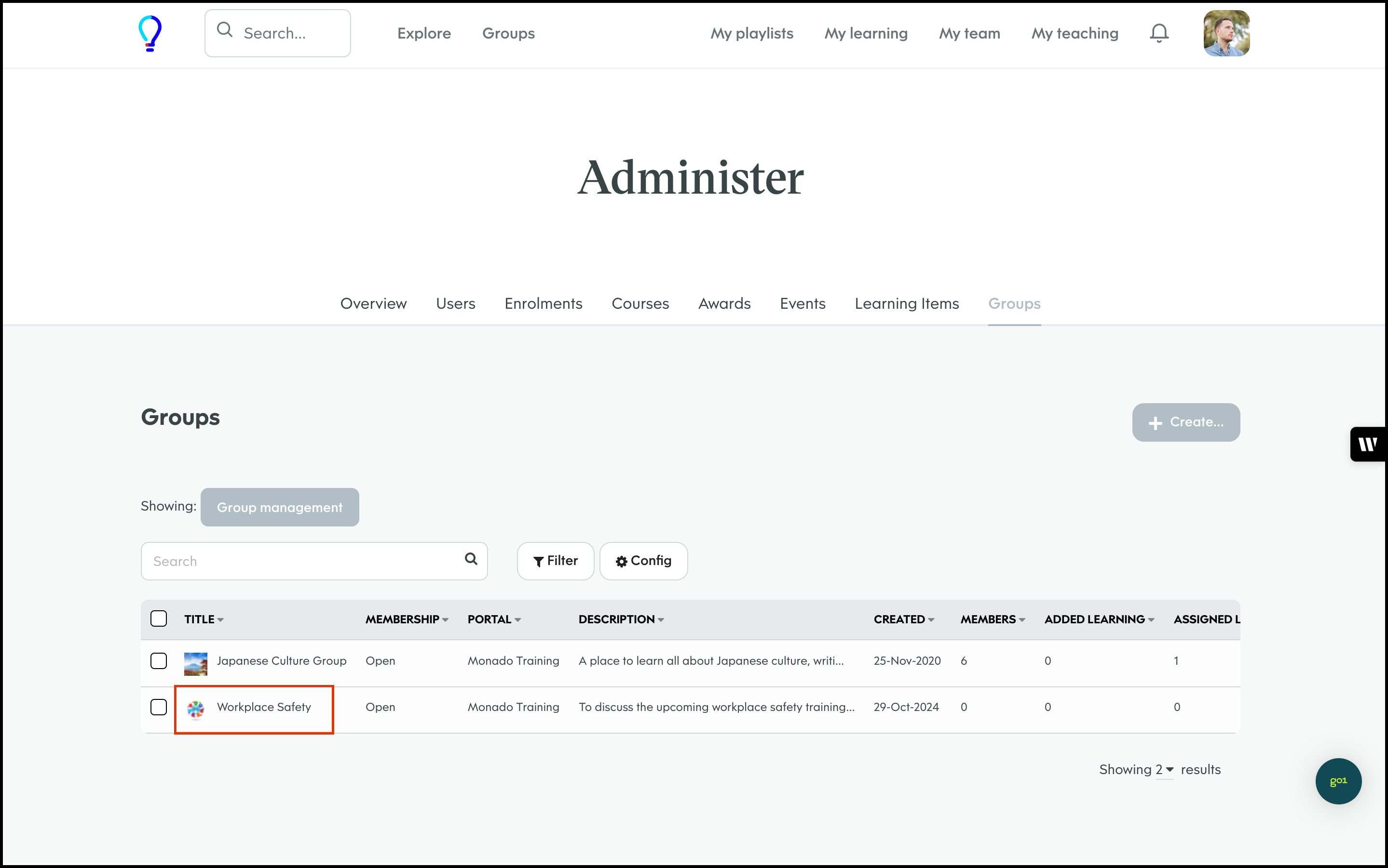The Group Management feature allows you to create your organisation's learning groups a user can join to discuss certain topics or training needs.. You can also use this feature to setup the membership details, edit the information, and setup the visibility of the group. Lastly, you can also use this feature to delete a group you no longer need or export the list of groups on your learning platform.