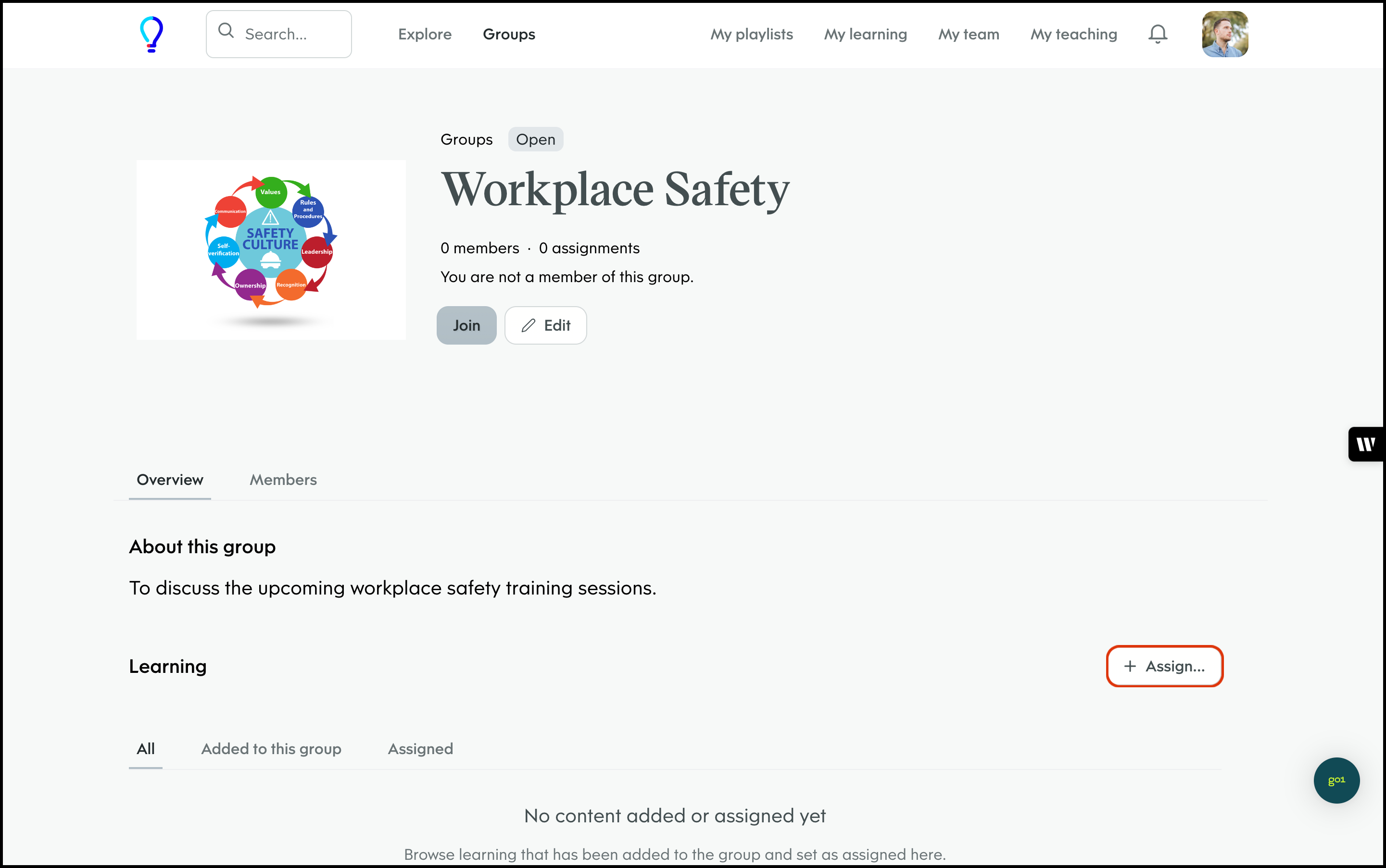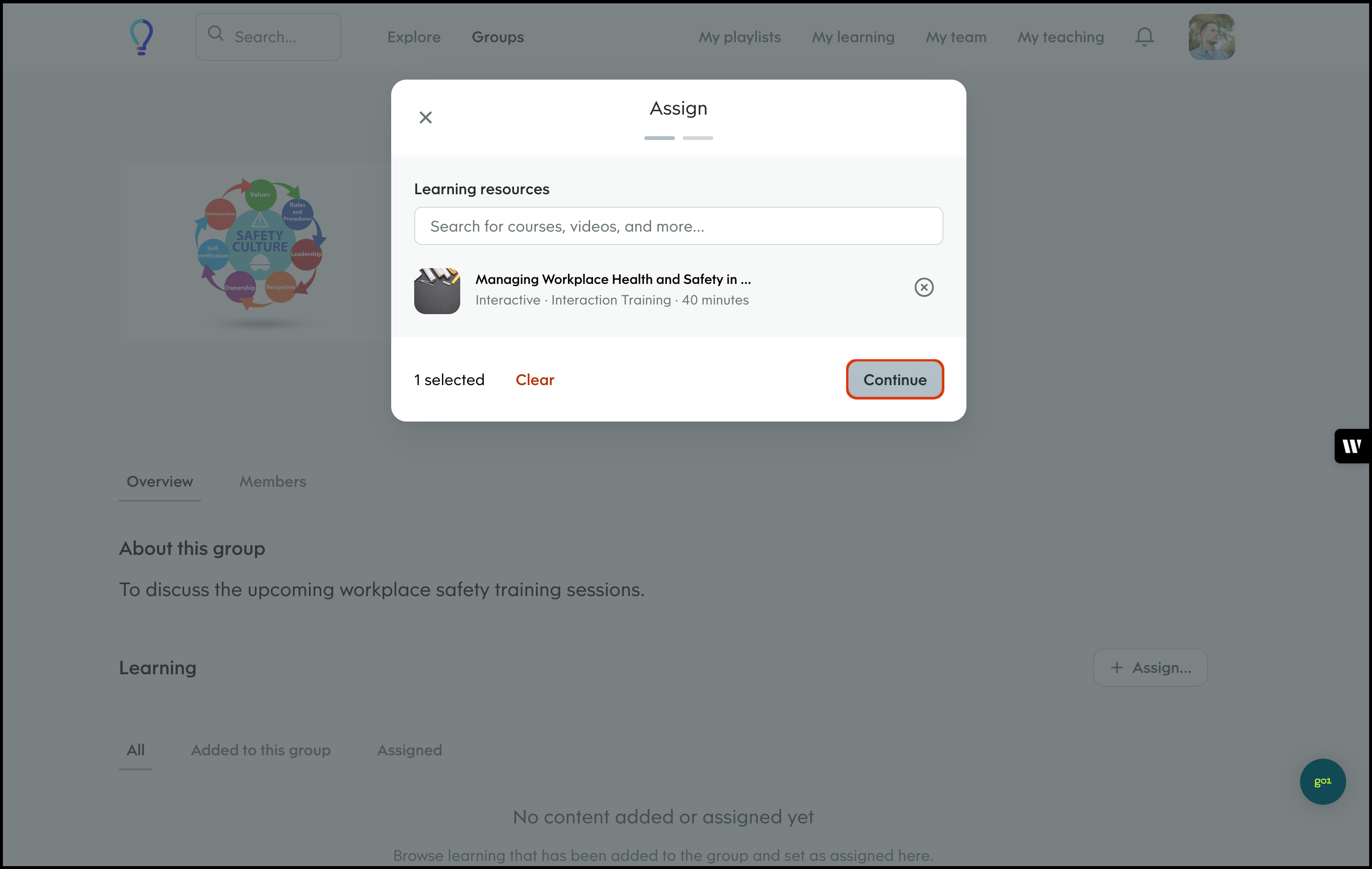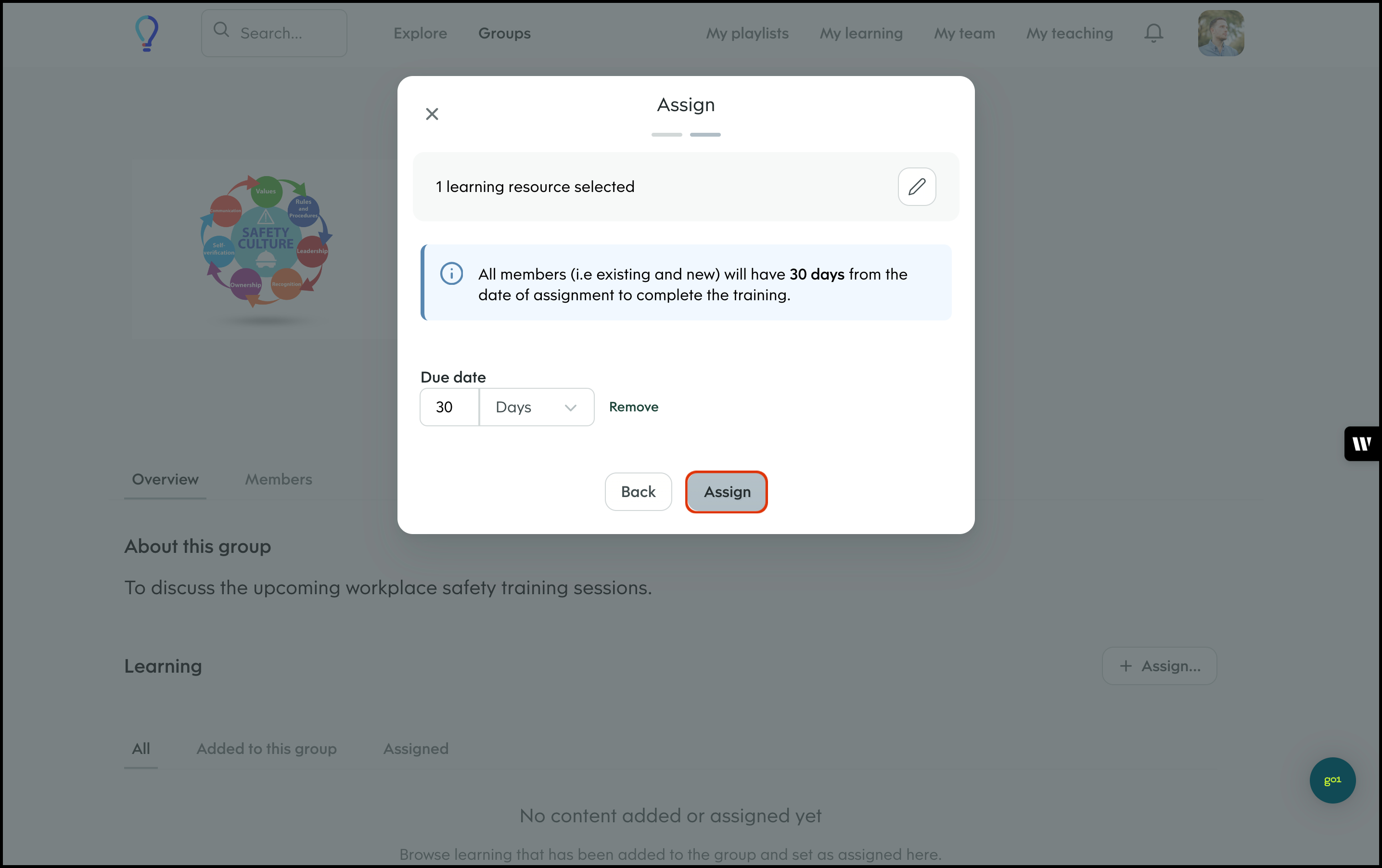 Note: Groups have a maximum limit of 50 learning resources assigned at any time. When assigning learning content, you can add up to 20 resources in a single batch.