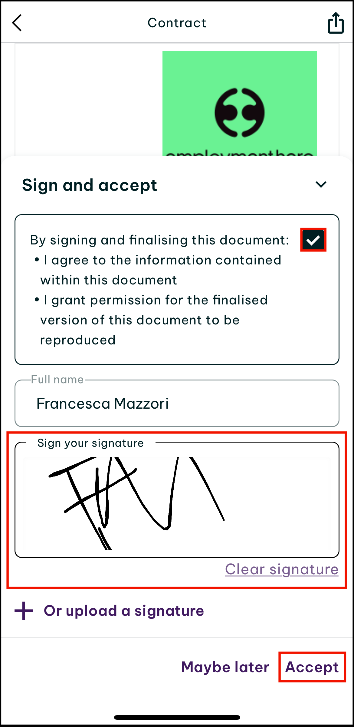Employment Hero makes issuing and signing contracts simple for employers and employees alike. Your employer will issue a contract from Employment Hero, where they will have the option to print the contract for you to sign, or email the contract for your to sign when you set up your Employment Hero account. If they email you your contract, then when you create your Employment Hero account, then next option is to read, acknowledge and then sign the contract.