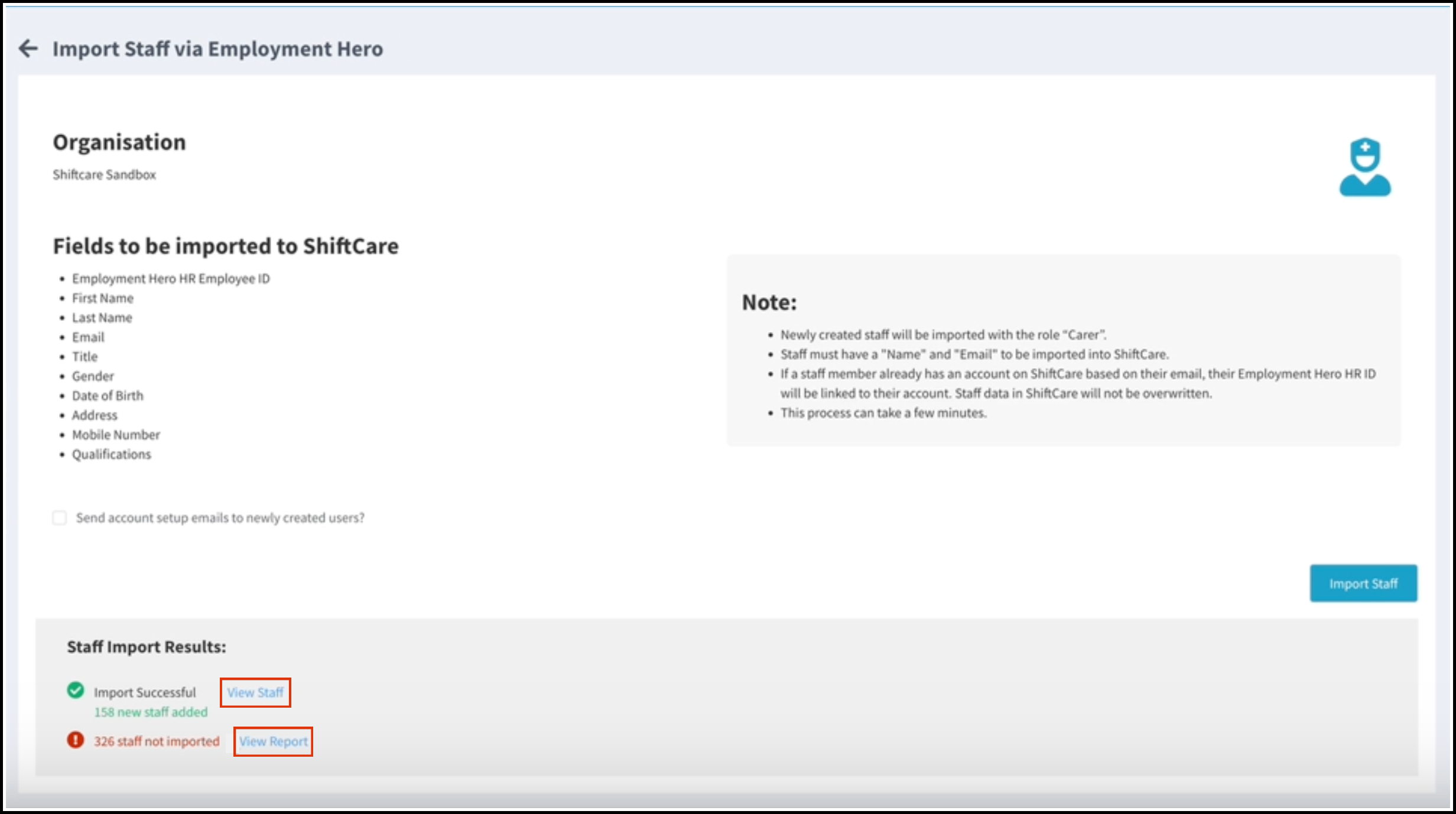 - The import may take a few minutes. Once the import is complete, you will be shown the number of successful imports and the number of staff not imported. You can now either: