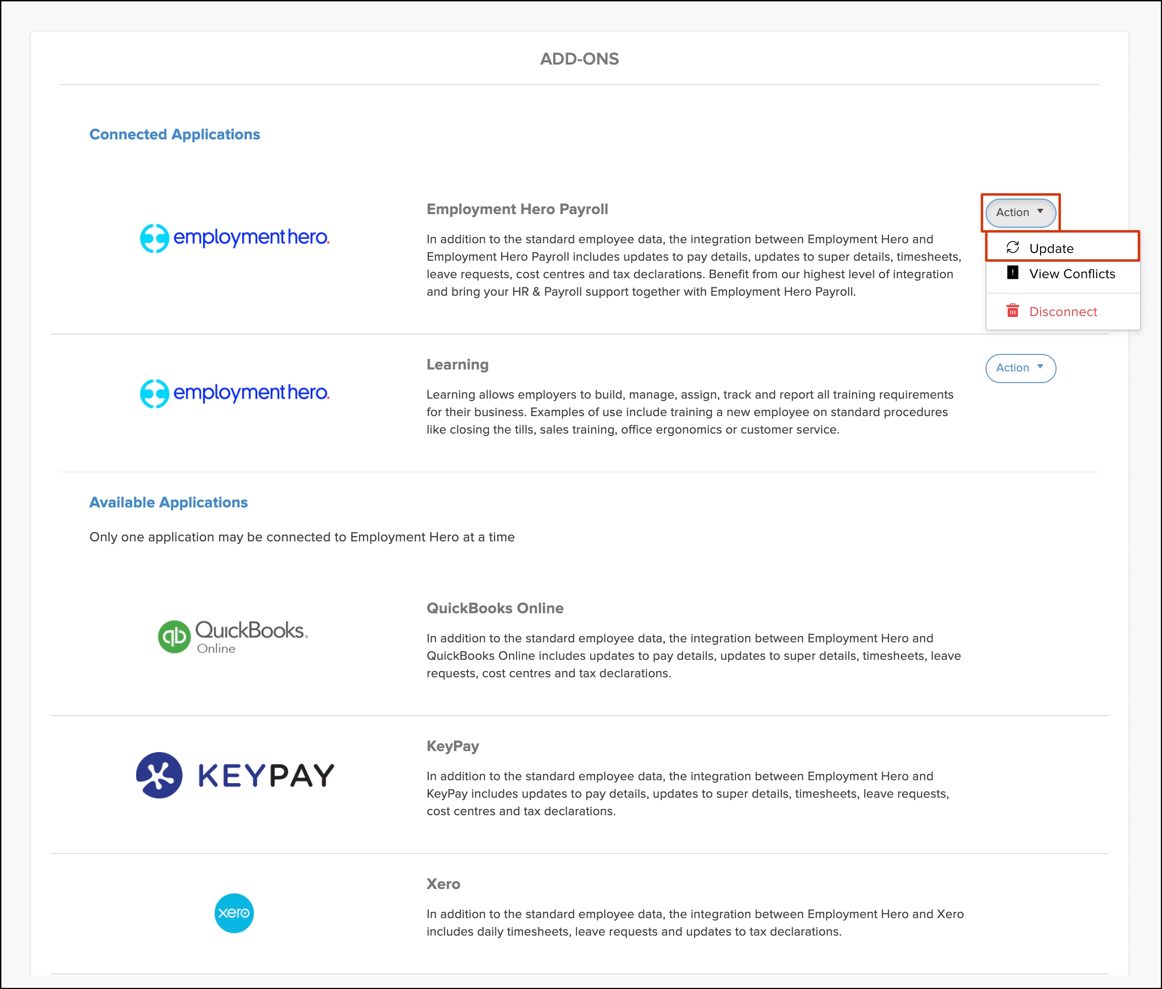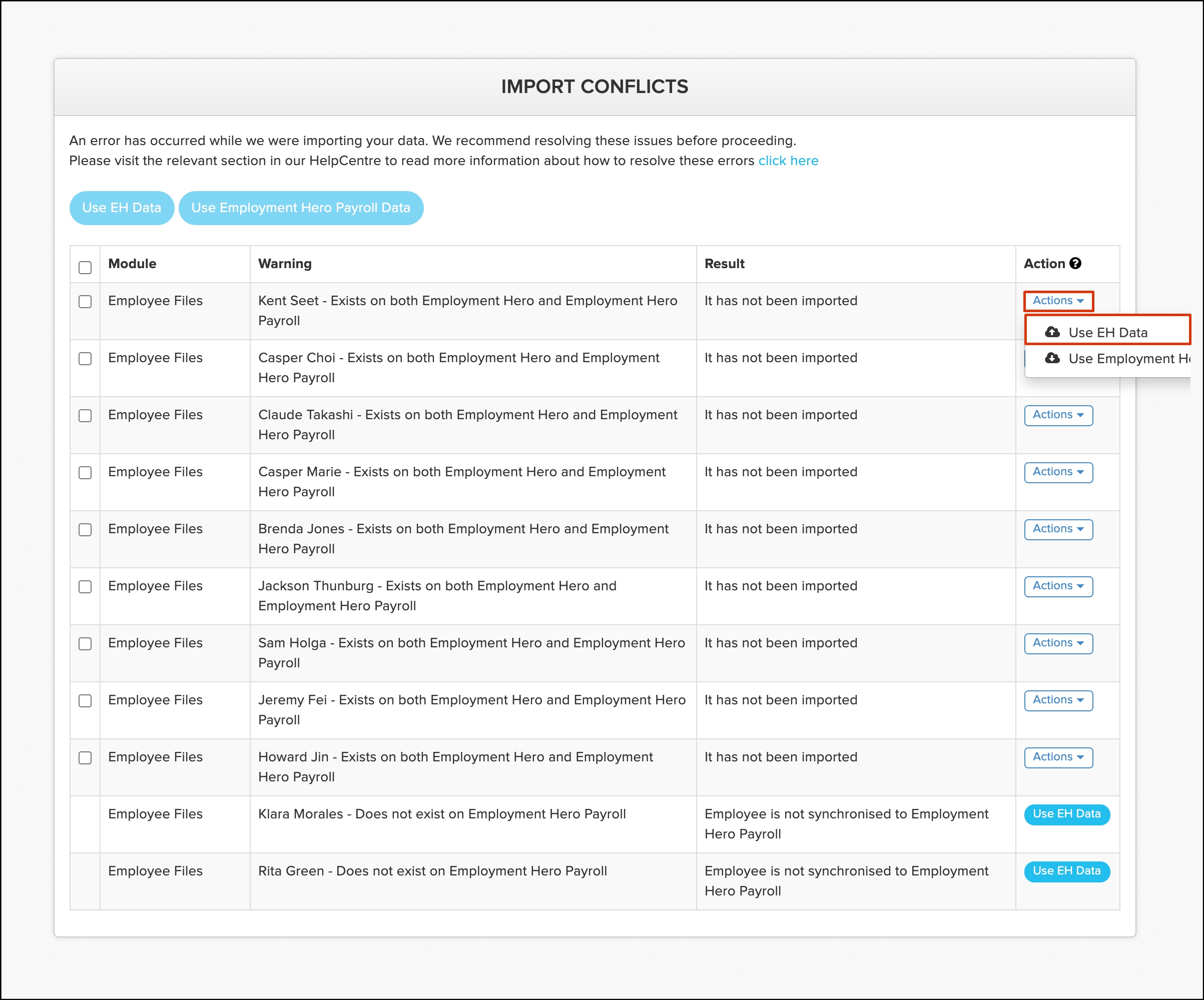 | Import conflict. | Employee File. | Employee exists on both Employment Hero HR and Employment Hero payroll. |
