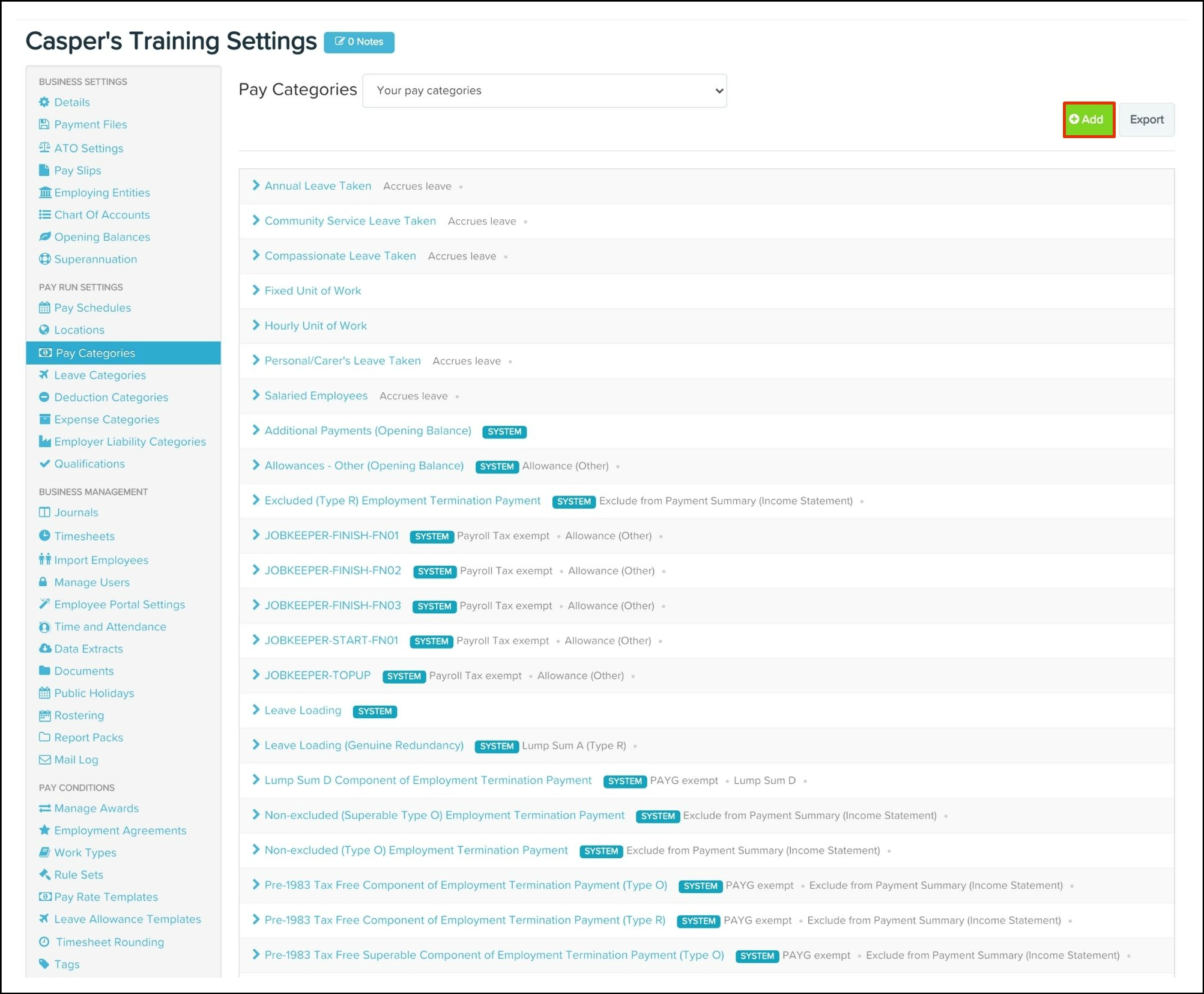 The Pay Categories page will now show a grey Updated button. This means the HR platform has successfully imported your pay categories from your payroll platform.