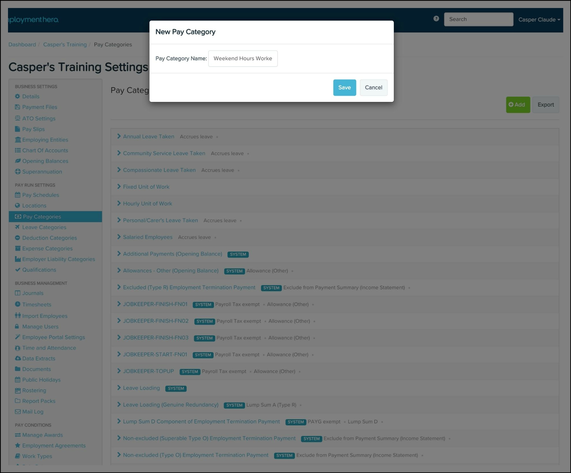 - Enter the pay category name and click the Save button.