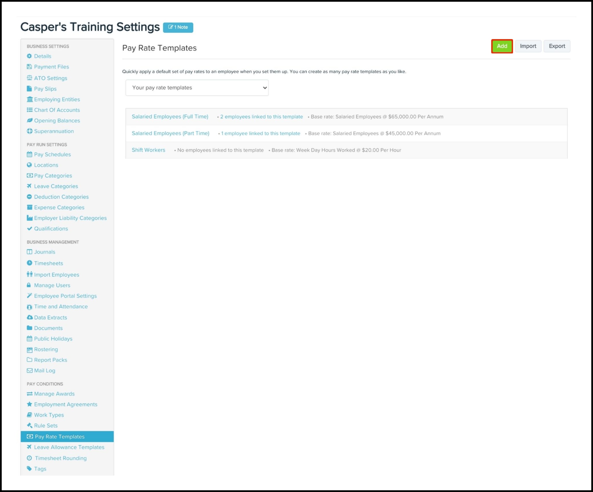 You can click the Add Linked Category button to link pay categories together. When linking a pay category to a base pay category, you only need to specify the base rate for the employee and it will automatically calculate the rate for the linked pay categories.