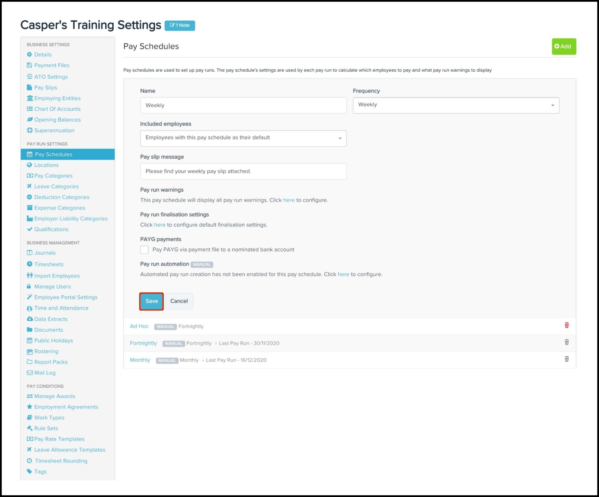 - Pay run finalisation settings.