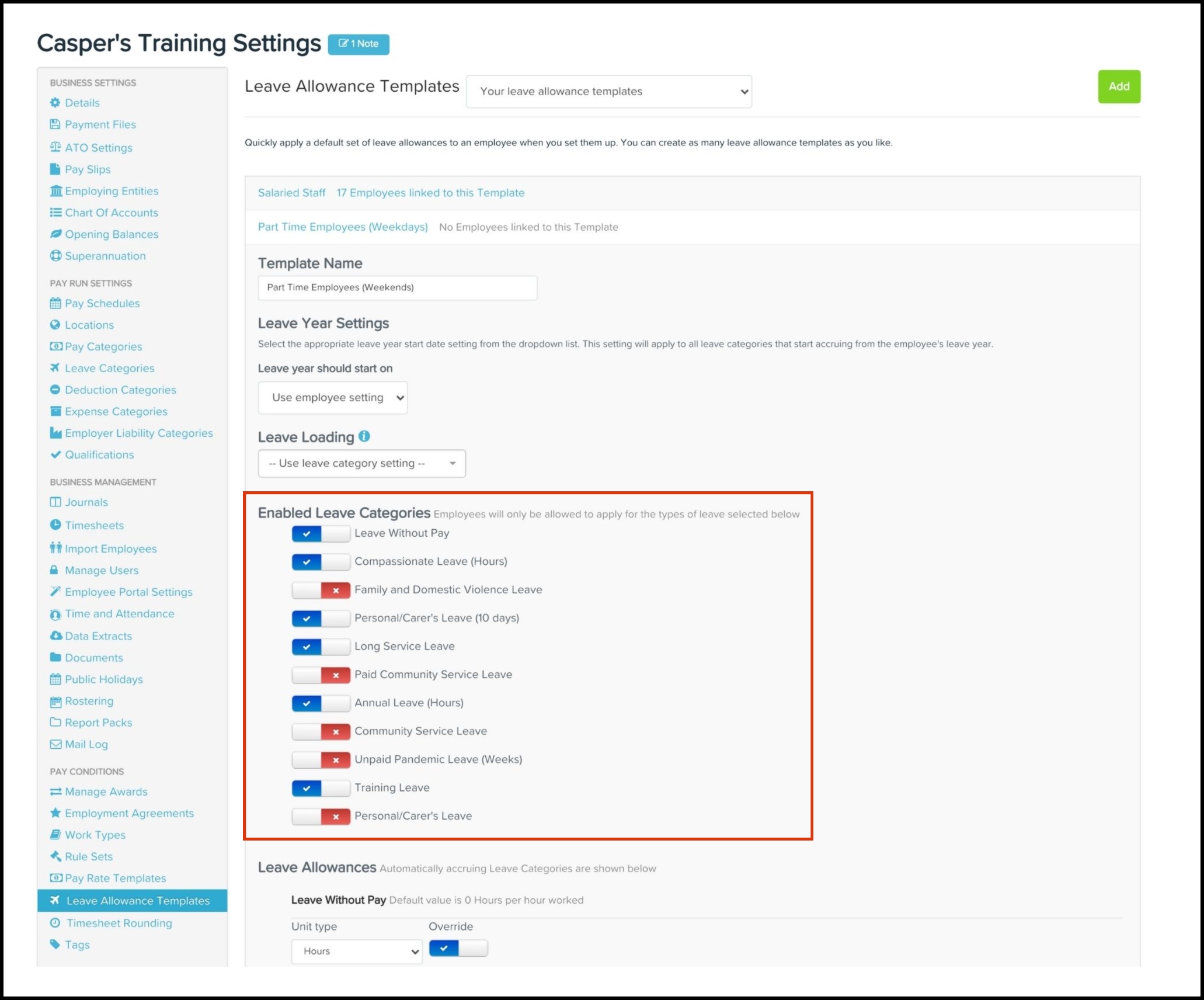 - Select the leave categories that need enabling.