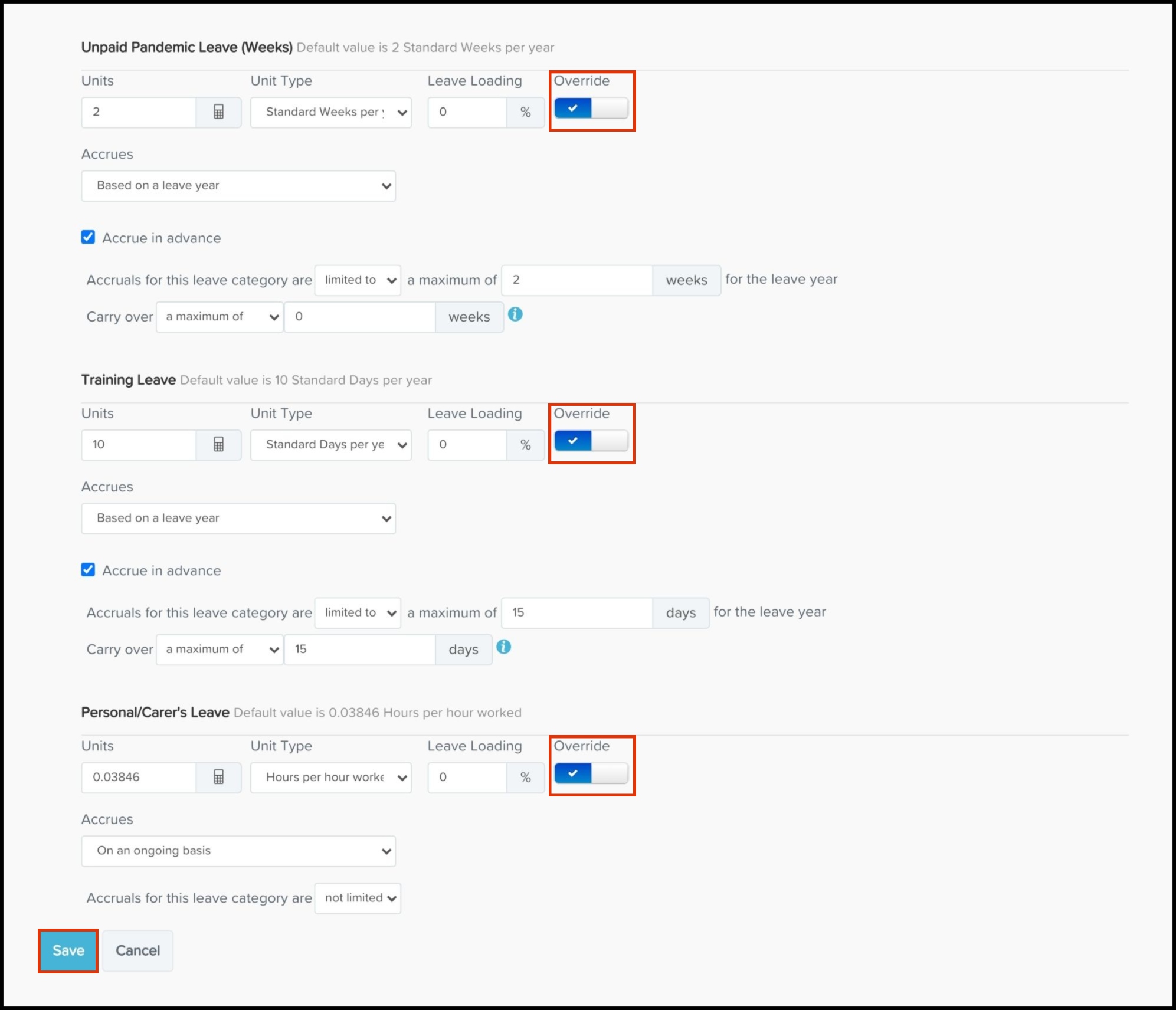 - In the Leave Allowance section, use the override toggle switch to change the data if required.
