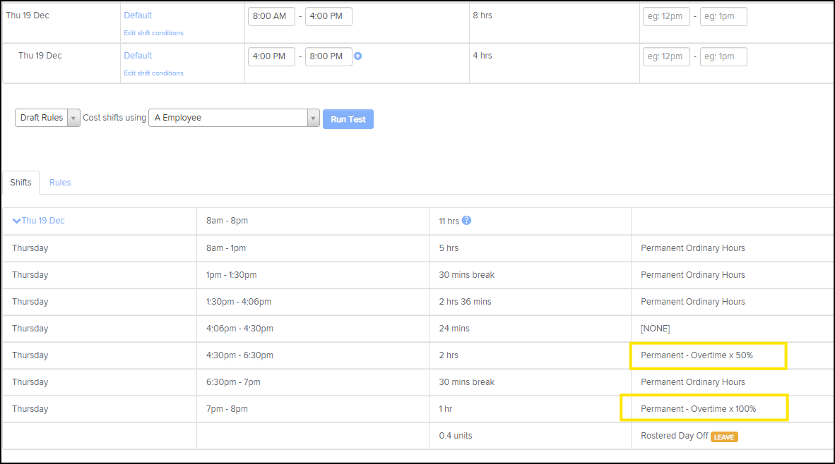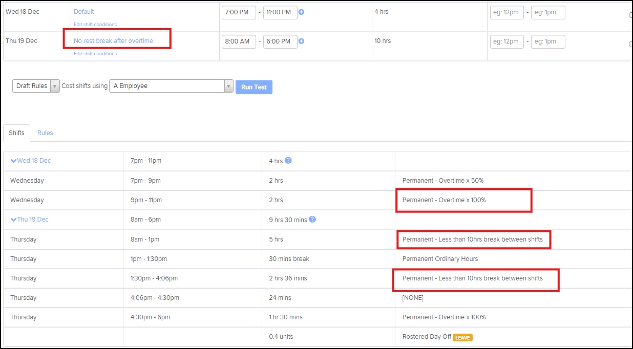 - When an employee does not receive a minimum 10-hour break between shifts and works overtime during their current shift, all overtime hours under this work type must be paid at 200% of the ordinary hourly rate.