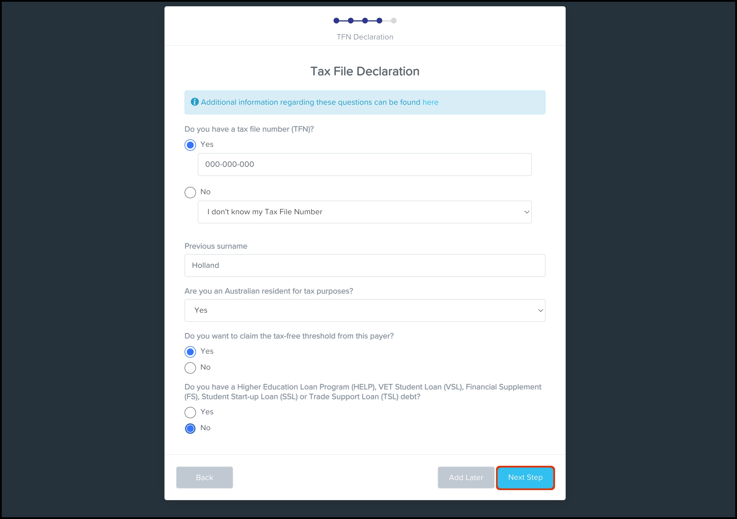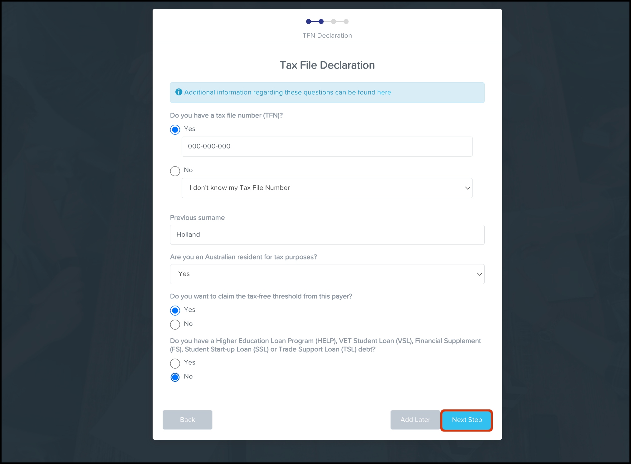 - Fill in your Tax File Declaration details, then click the Next Step button.