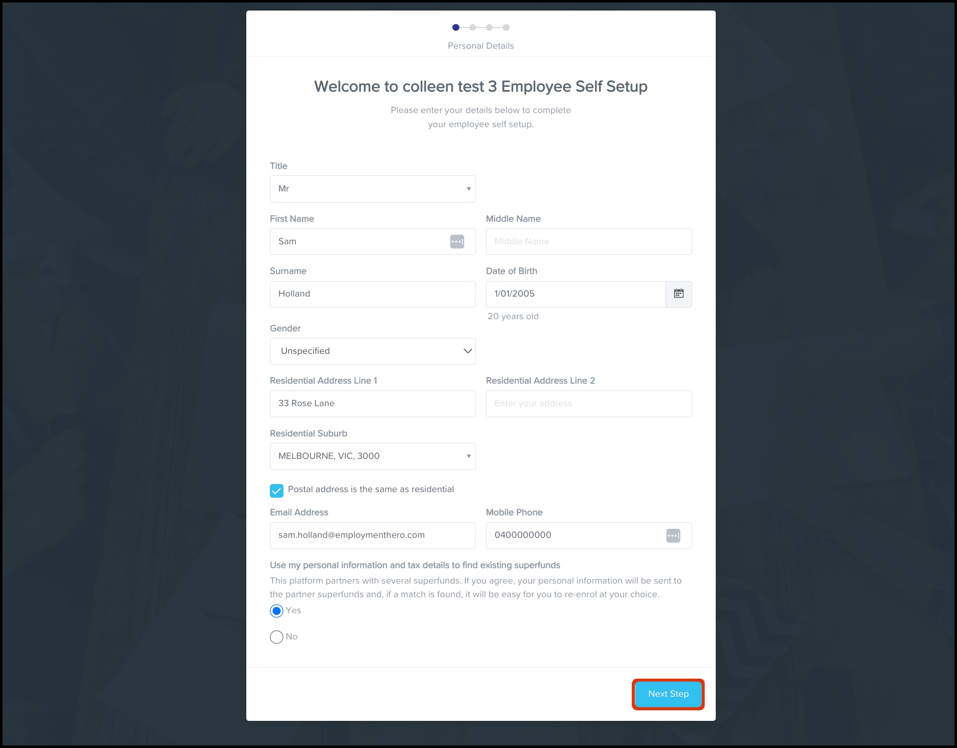 - Enter your personal details. (If you want to have an easy superfund re-enrolment process at any point, the Yes toggle near the bottom of the form is recommendable.)