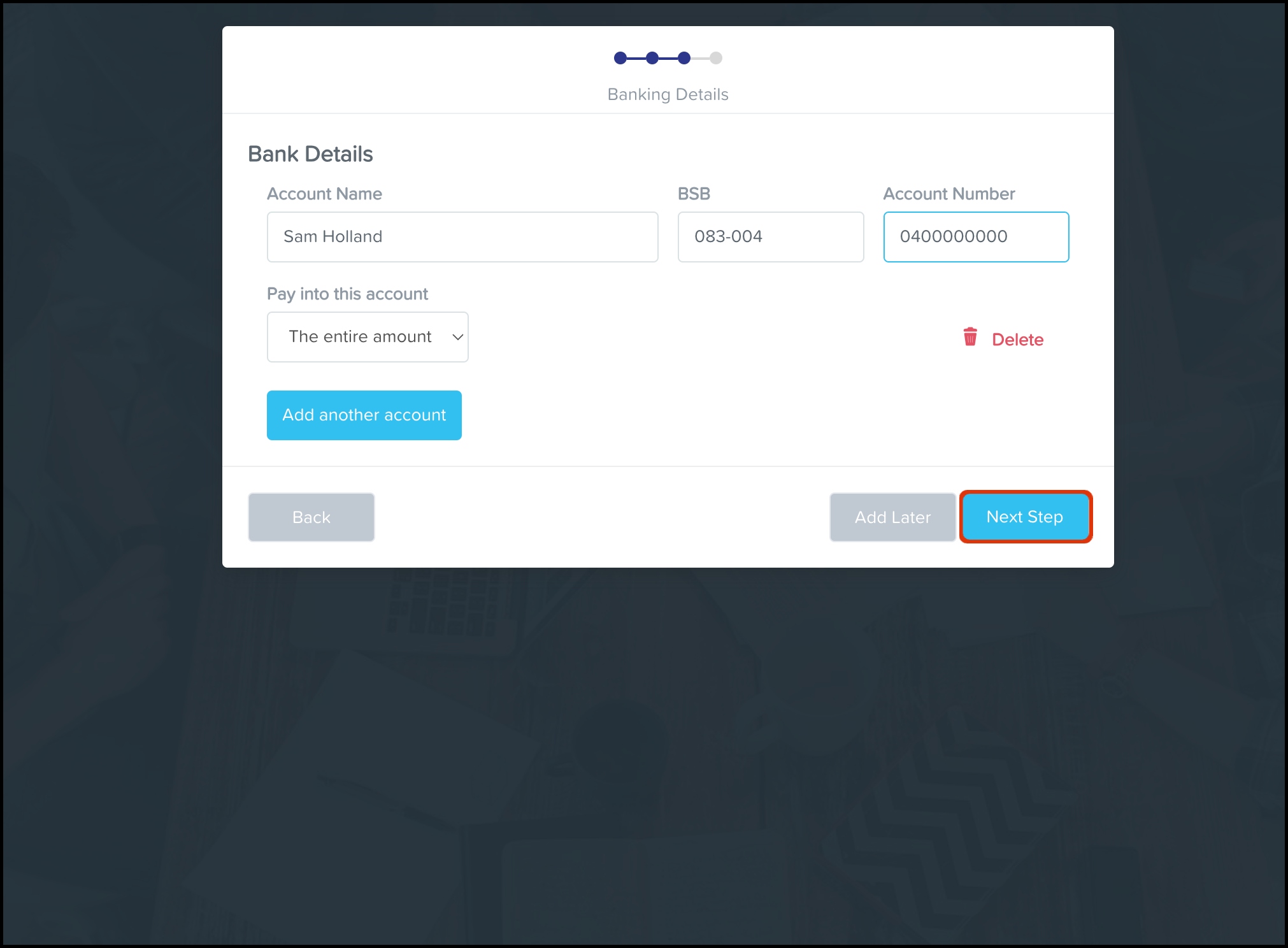 - Enter your banking details, then click the Next Step button.