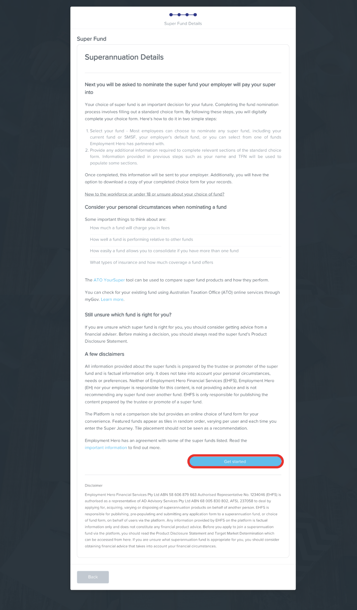 - Ensure you are satisfied with the information on the Super Fund Details page, then click the Get Started button.