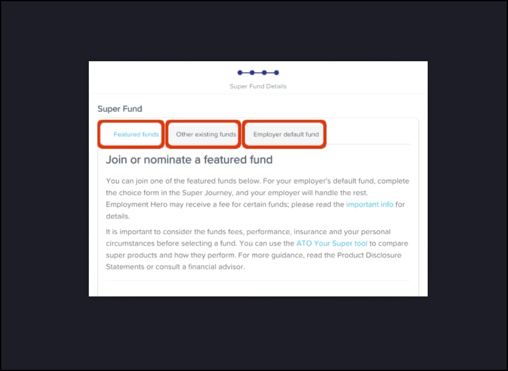 - Click your chosen super fund's Learn more button (if you are on the Featured funds tab) or its Nominate button (if you are on either the Other existing funds tab or the Employer default fund tab).