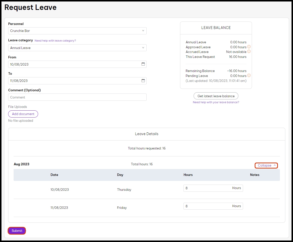 Do not complete the rest of the leave request details and push Submit Leave, if you are only viewing an employees leave balance.