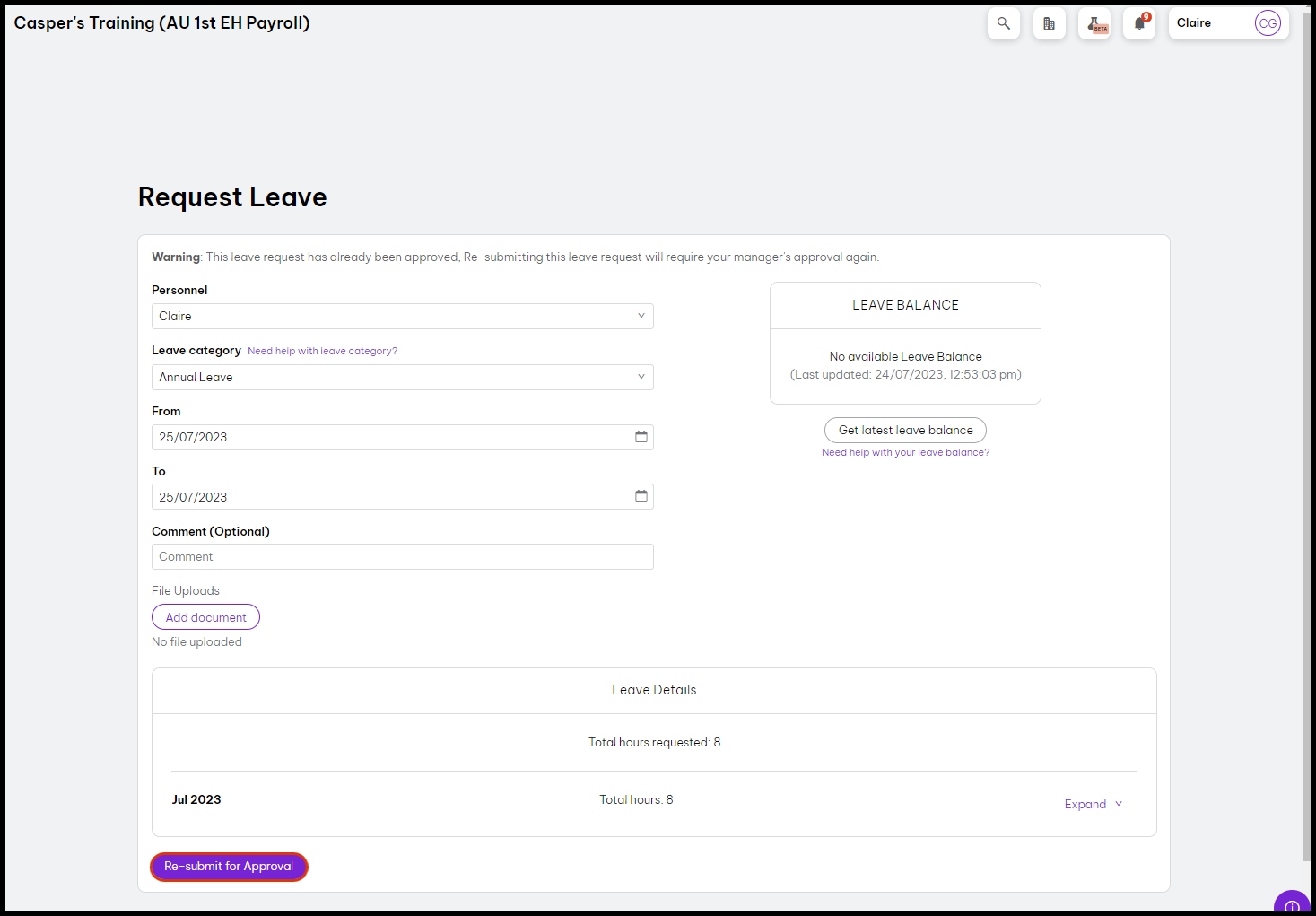 Once you approve a re-submitted leave request, the leave request will re-sync automatically.