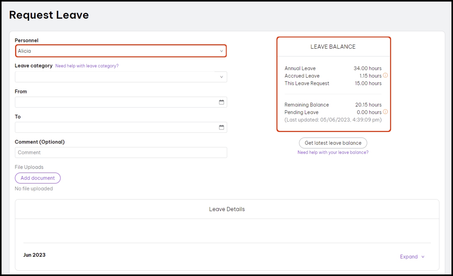 - Use the Personnel field to select the employee whose leave balance you want to view.