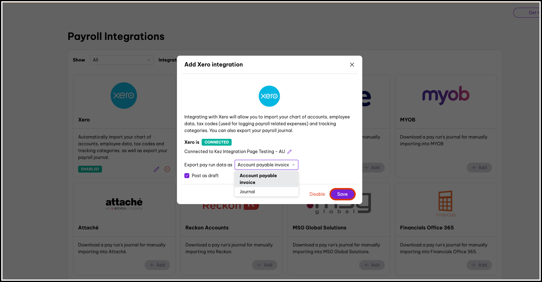 6. Depending on the type of service you connect to, you may need to complete additional fields such as how you would like pay run data exported. Once you have added your desired settings, click Save.