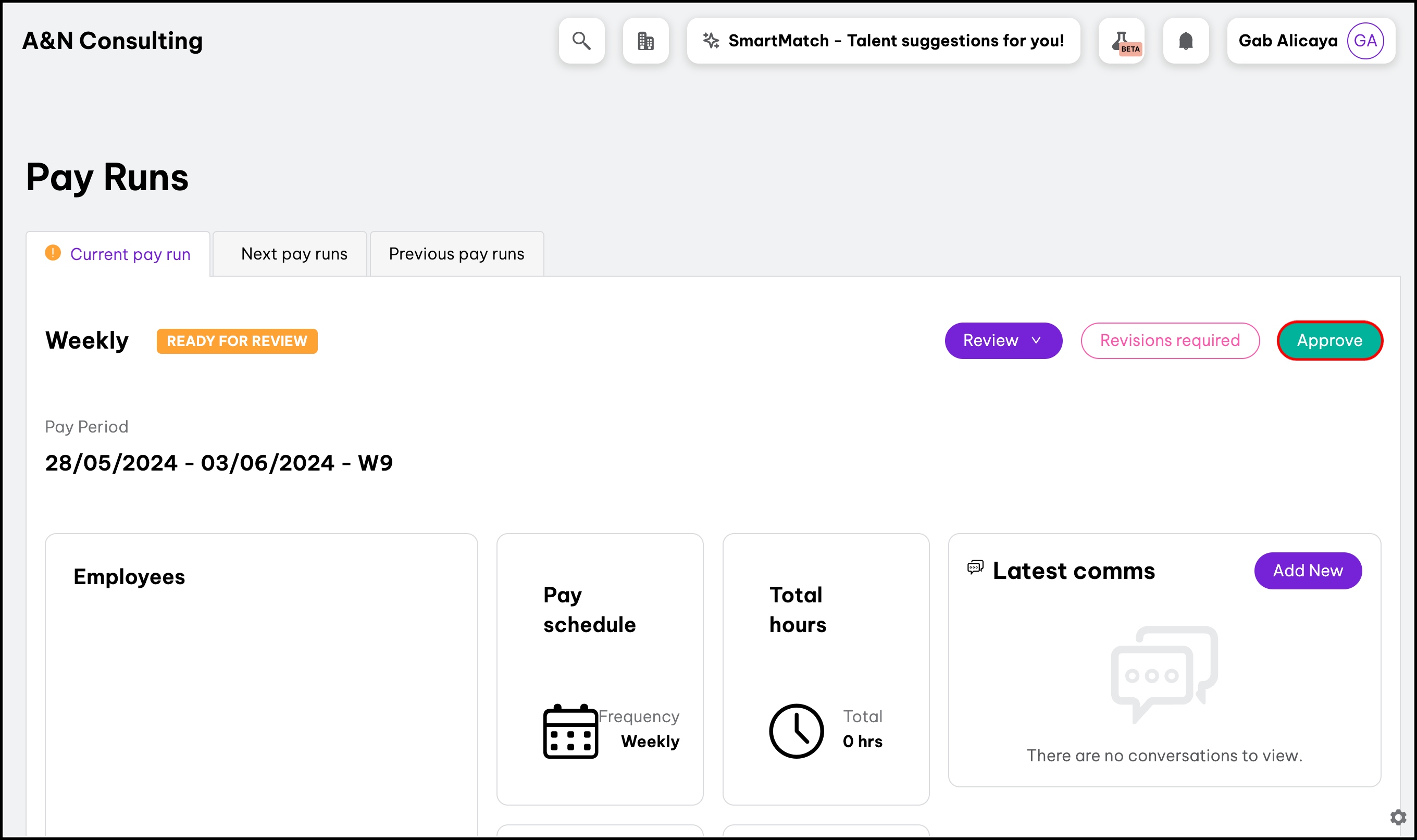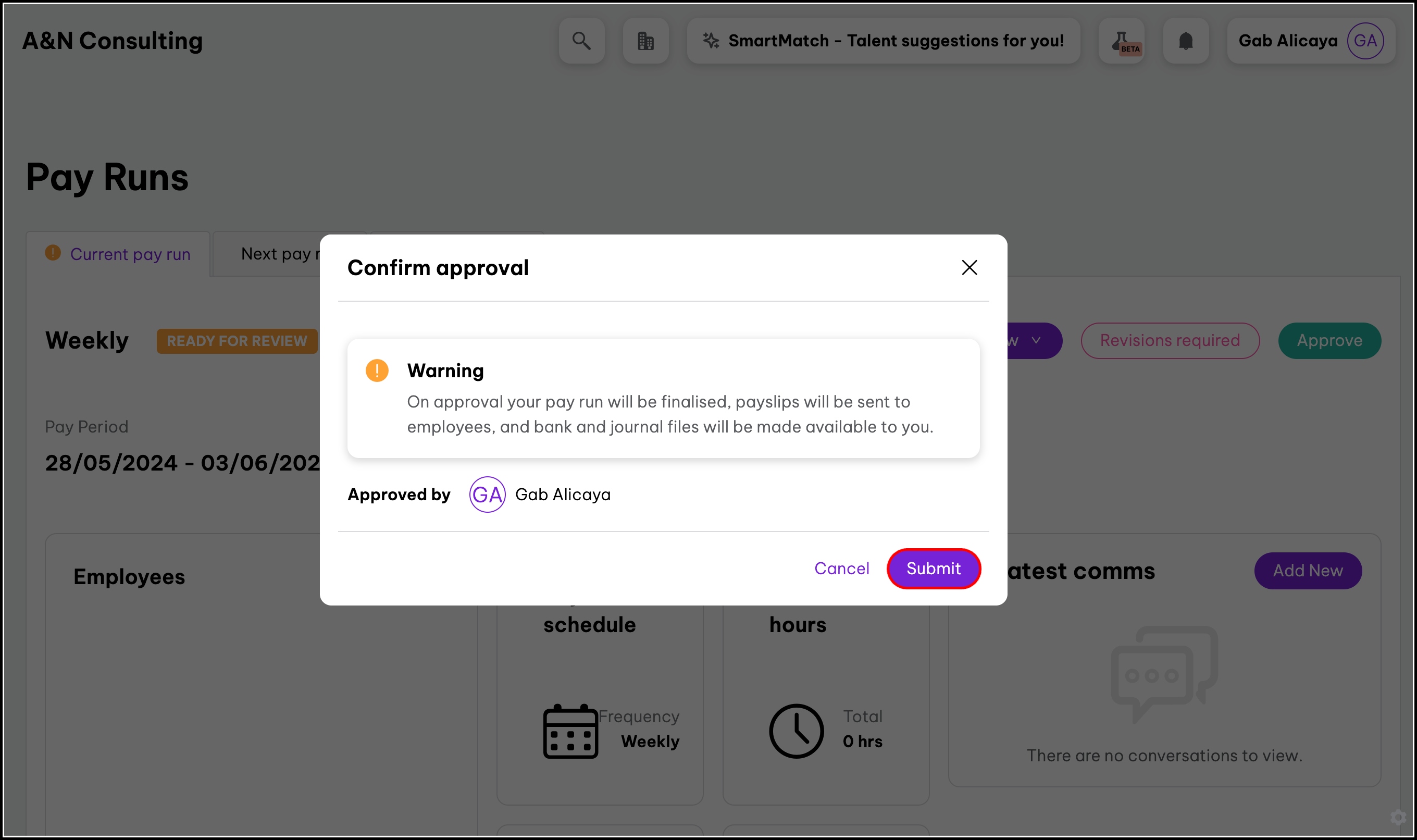 - An approval confirmation popup will appear, where you can leave a comment for the pay run.