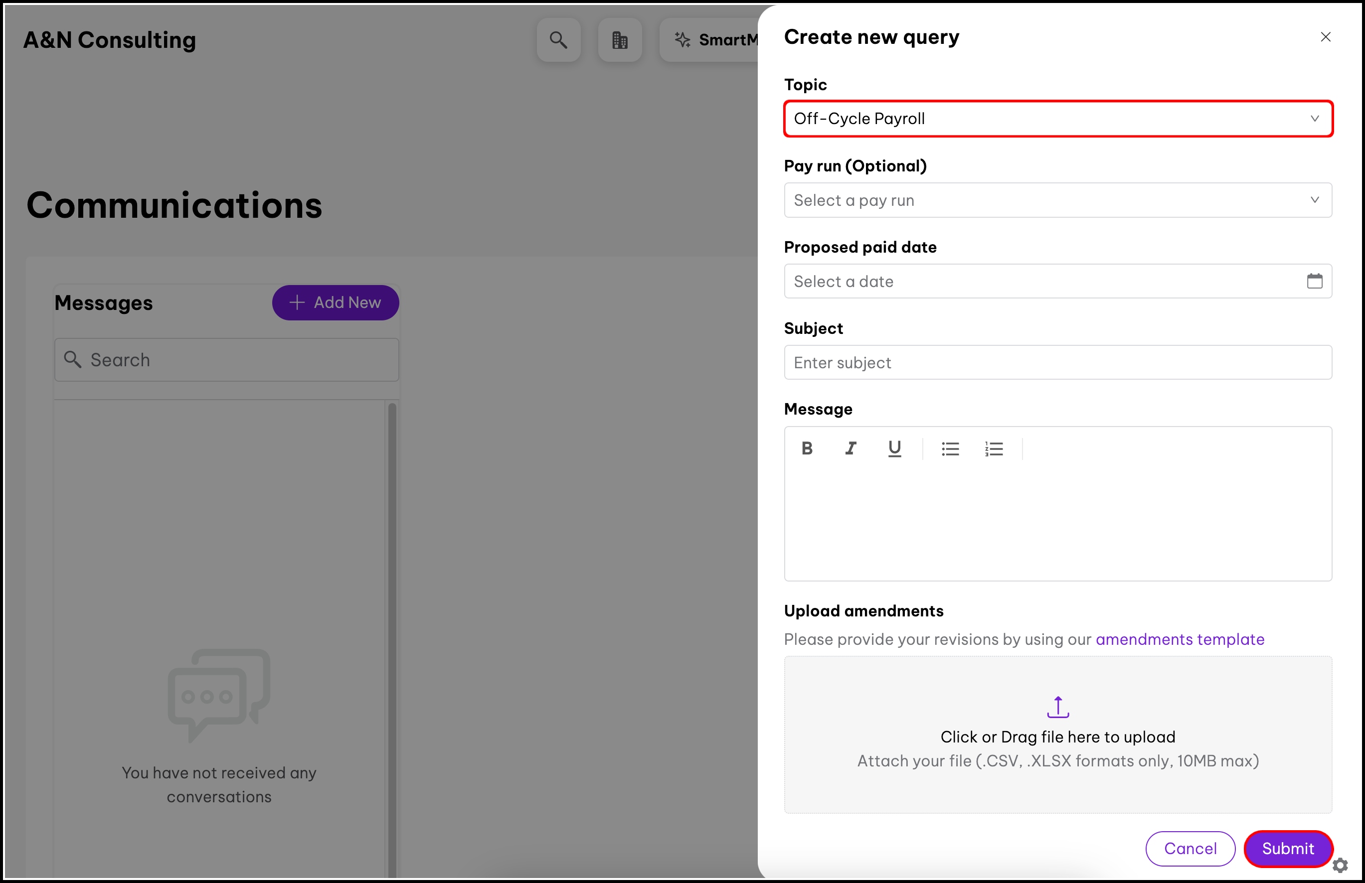 Sometimes, you may need to make unscheduled payments to employees outside of your typical pay period. When this happens, you can use the Communications feature in Payroll to send in an off-cycle payroll request. You will not be able to prepare this on your own. Instead, the Employment Hero payroll team will take care of it for you.