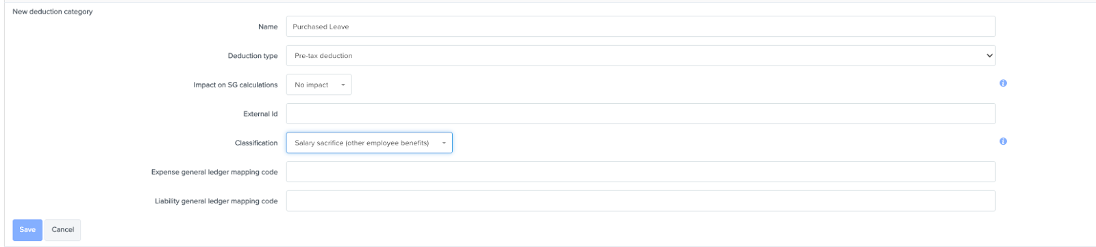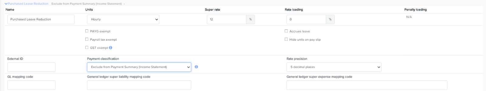 - Create a New Pay Category > Set up a new pay category, e.g. Purchased Leave Reduction, with the following settings: