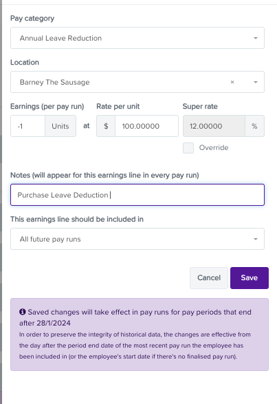- Change the salary of the employee by dividing leave weeks by total weeks e.g. 2 weeks extra annual leave would be Salary x 50/52. You can enter the new rate on the Employee file > Pay run defaults page.