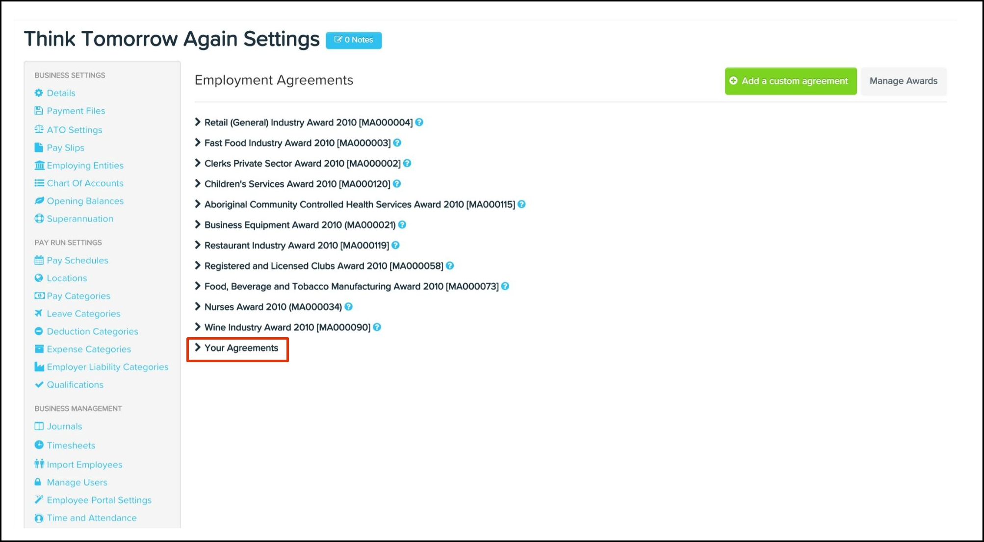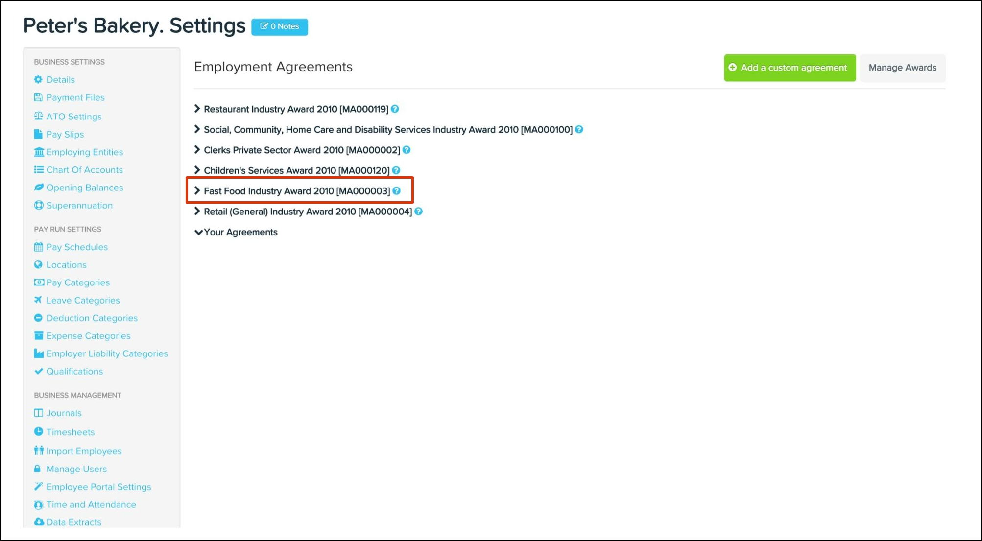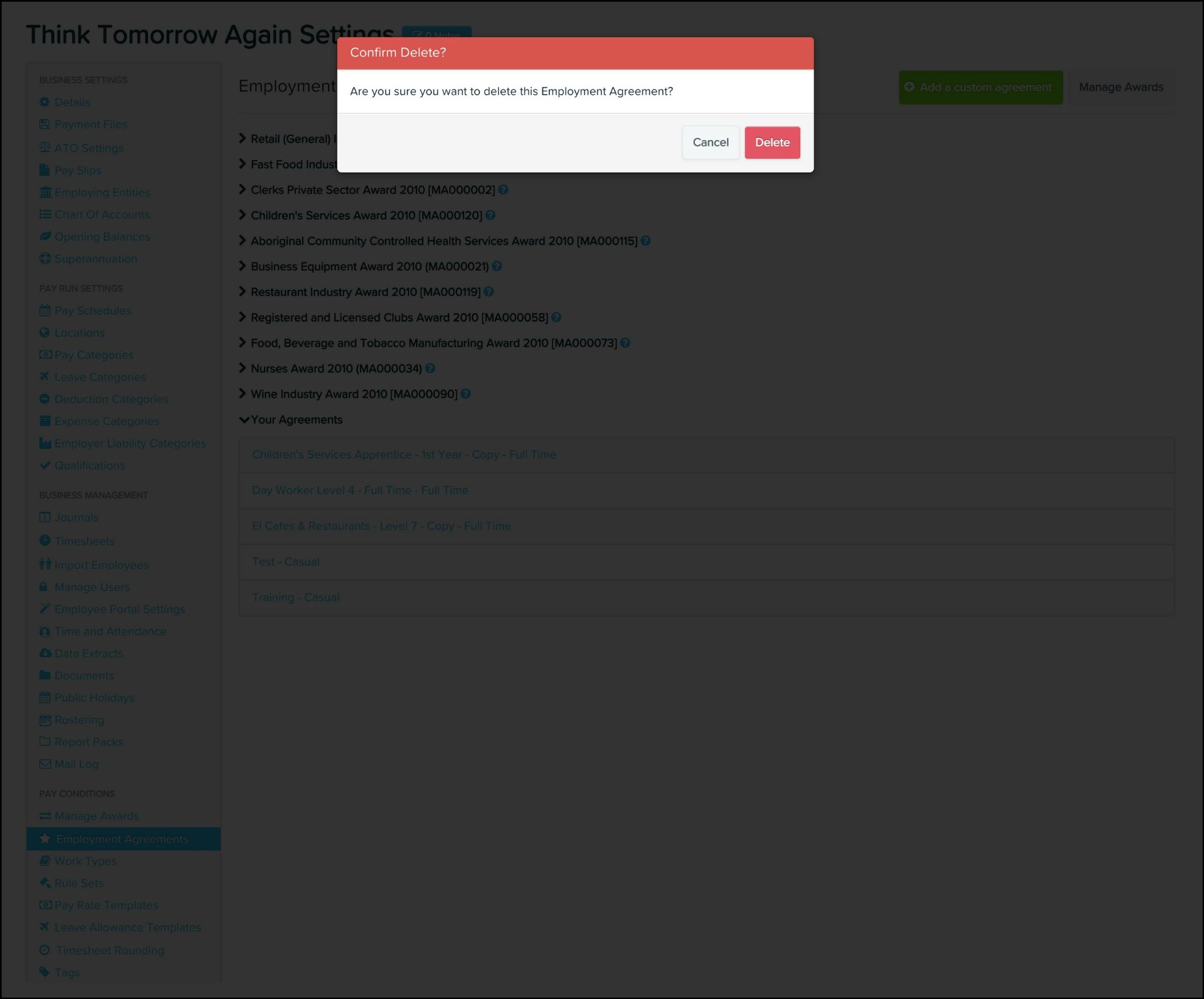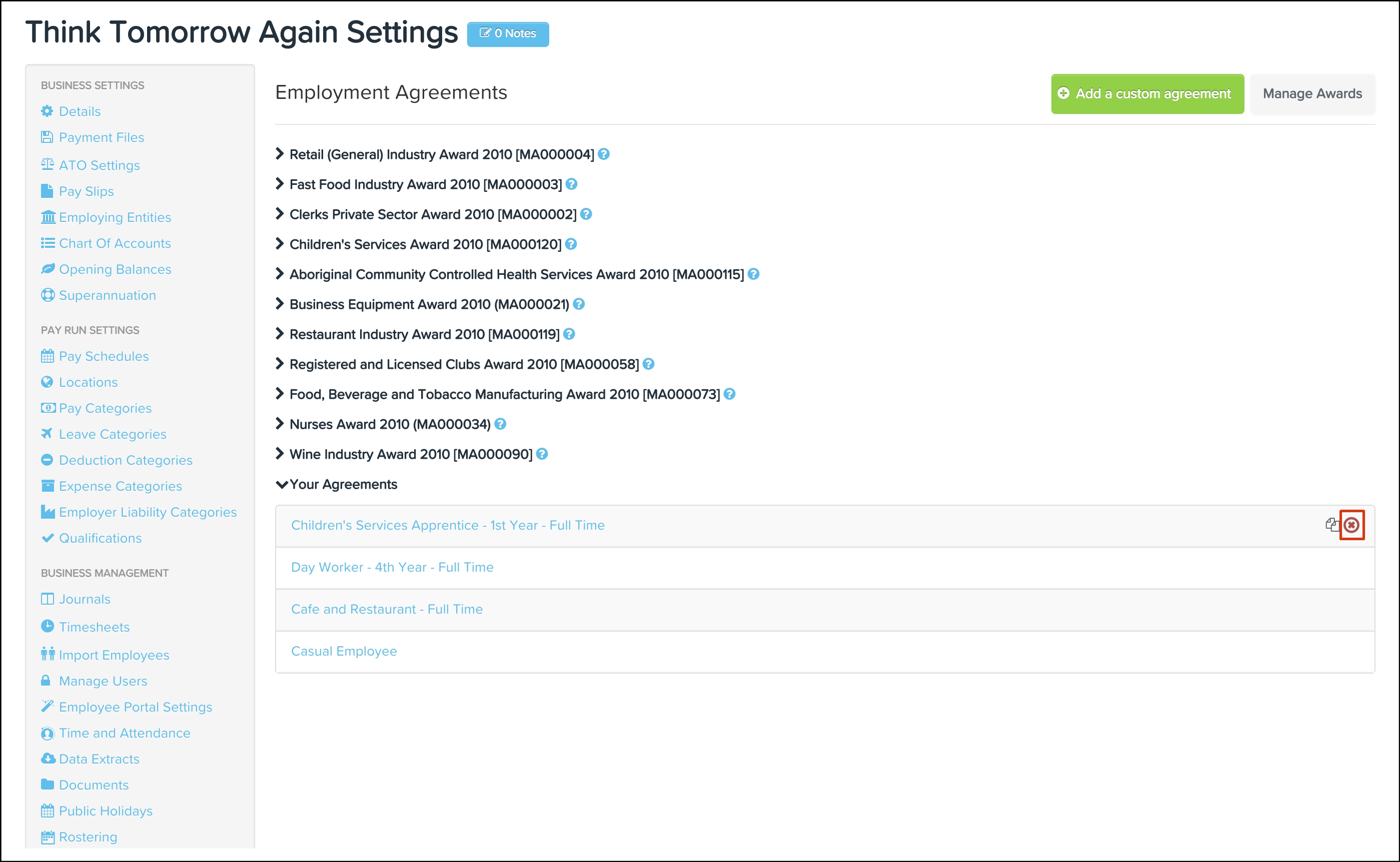 The employment agreements feature allows you to add customised agreements, edit award components and delete your own customised agreements along with any non-required pre-built award component.