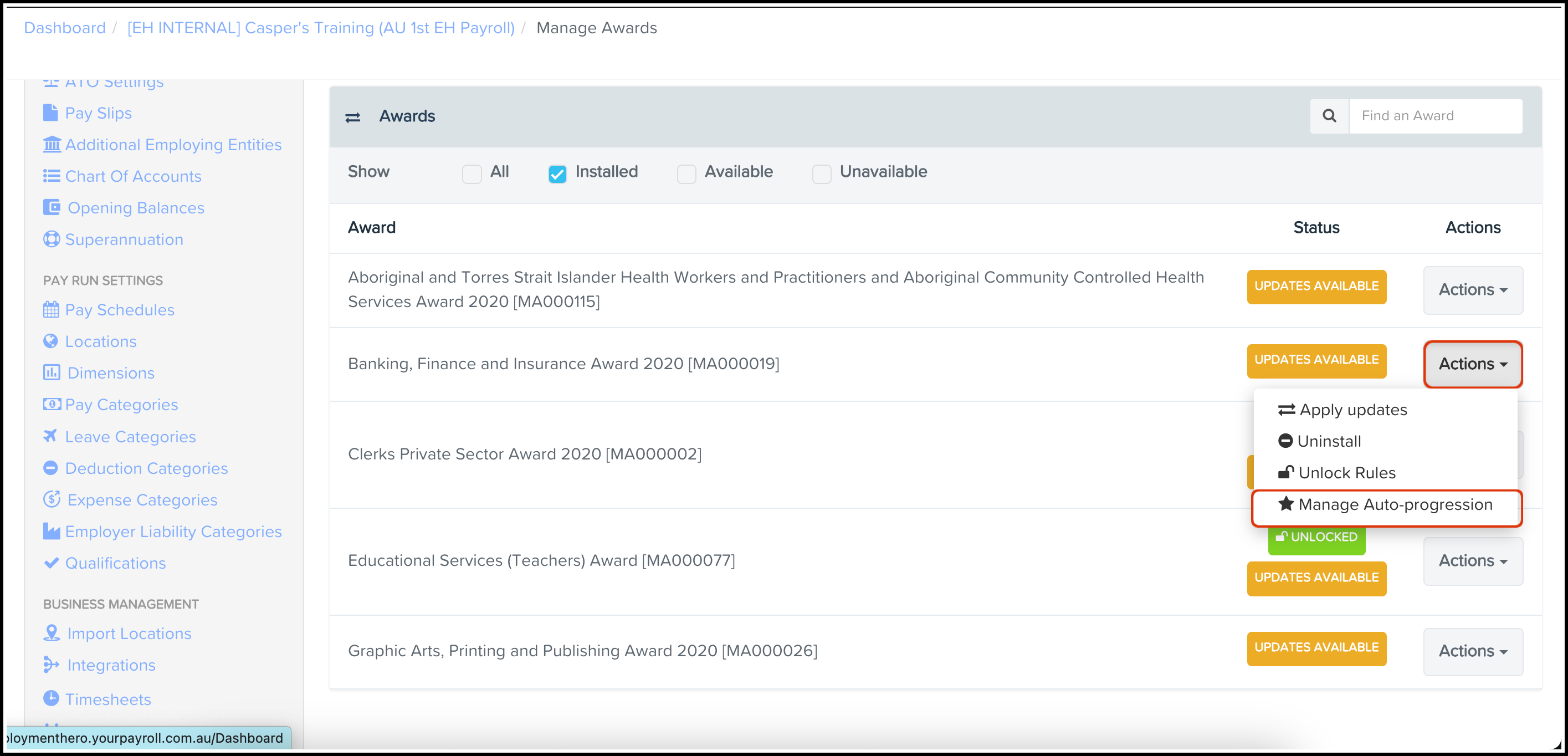 Auto-progression automatically moves employees to the next pay rate template based on their anniversary date or age. This works well for full-time employees but may not suit part-time or casual employees who need to meet specific requirements (hours worked, qualifications, etc.) before progressing.