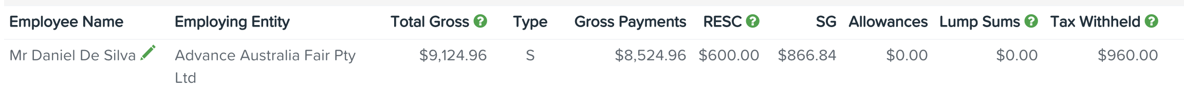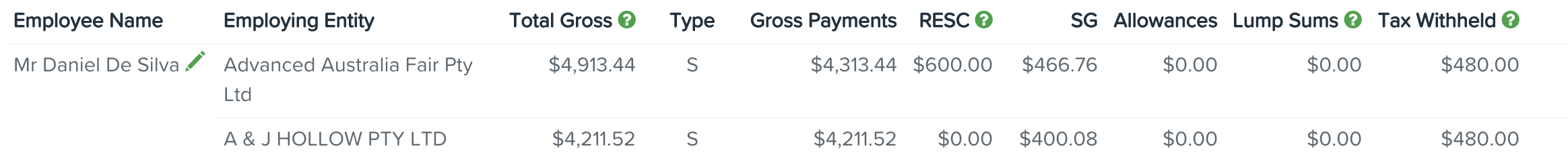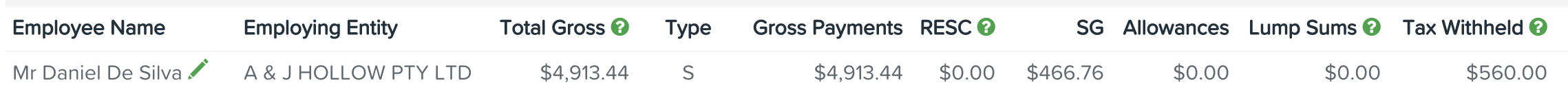N.B. There is an earnings difference for A & J Hollow Pty Ltd between this event and the update event because this pay event includes a subsequent pay run and so the earnings are higher.
