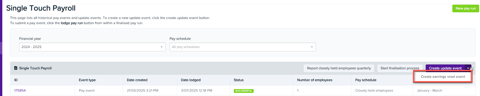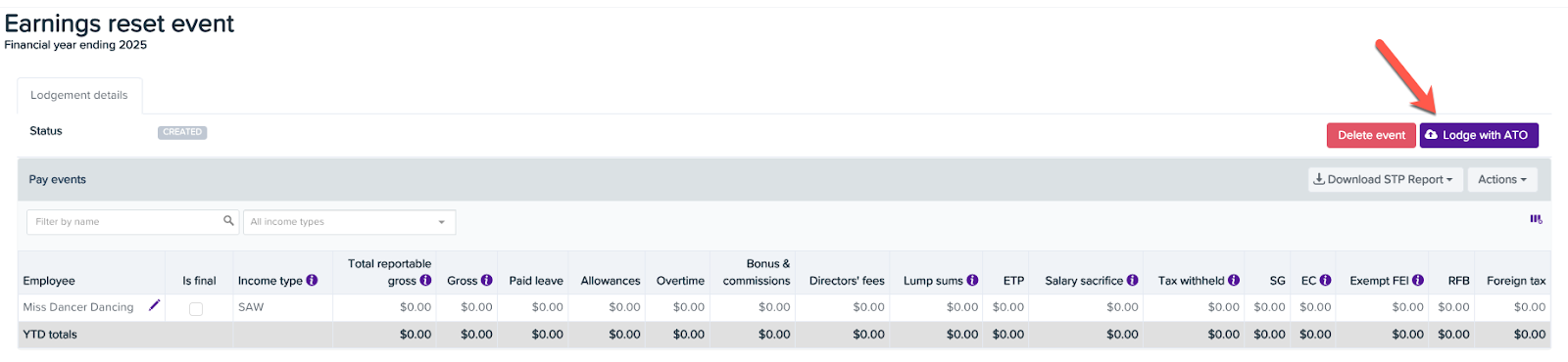 - Lodge the reset earnings event with the ATO. Wait till you know it has been successfully lodged.