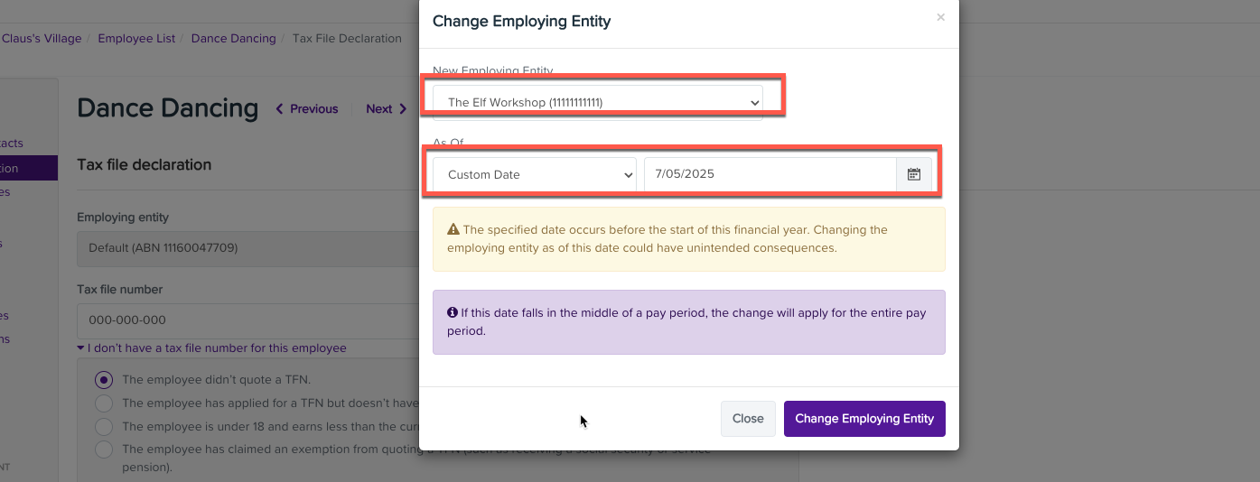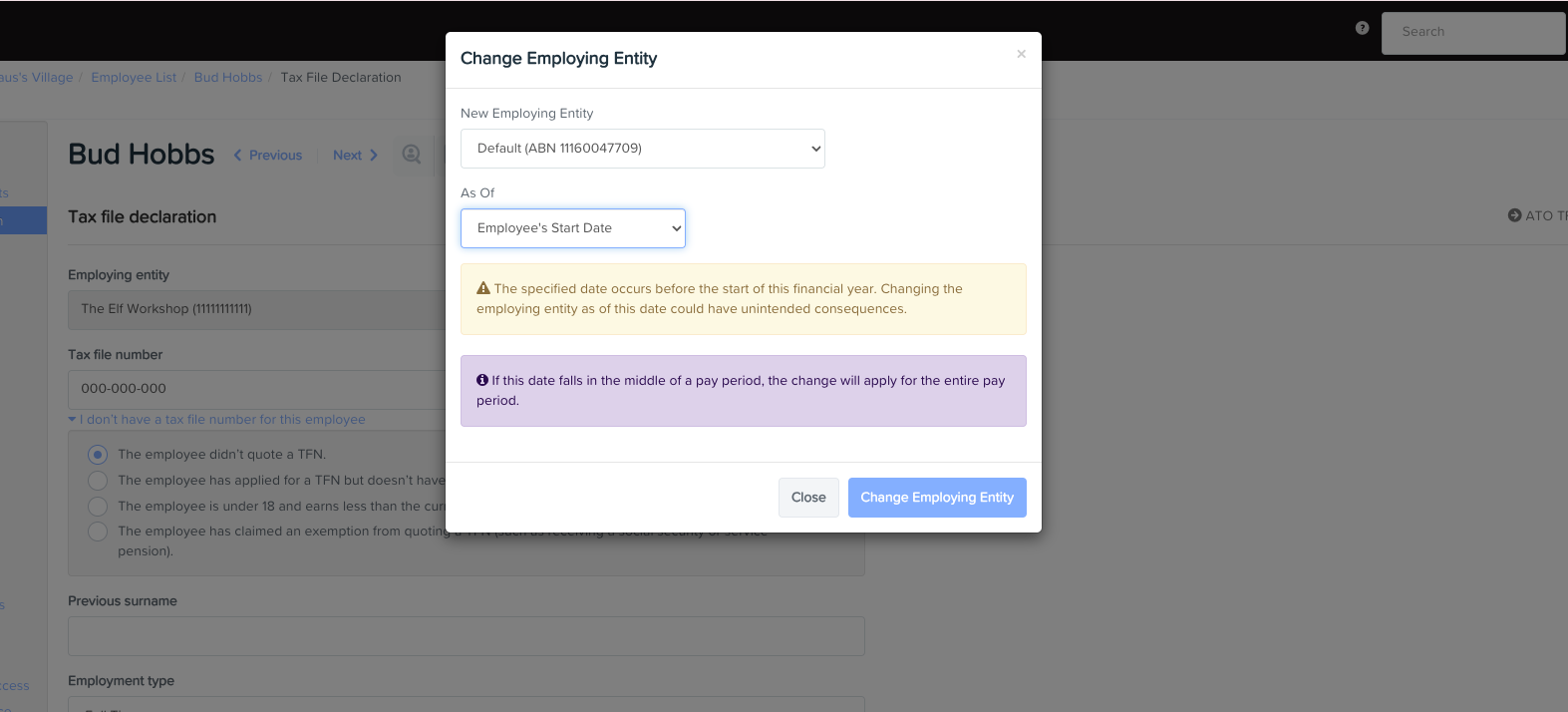from these instructions. N.B. You must have created the new employing entity within the system before assigning to the employee. It is best that you create an employing entity rather then changing the legal name and ABN details via the payroll setting's Details screen as this creates a whole other can of worms, particularly if circumstances arise that require STP reporting for a previous financial year to be revisited.