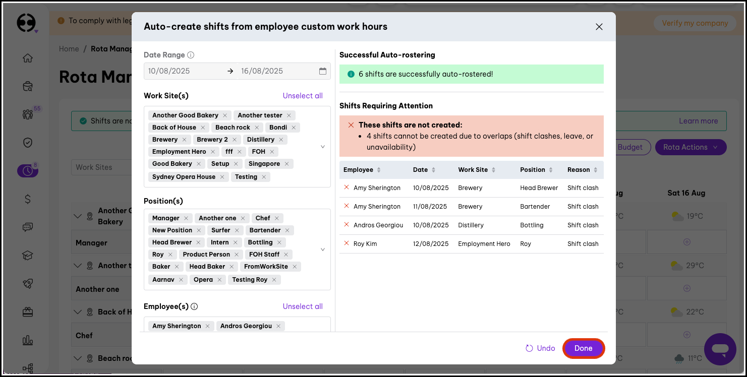 - Resolve conflicts first: Address leave requests, unavailability, or existing shift clashes before re-running Auto Rostering.