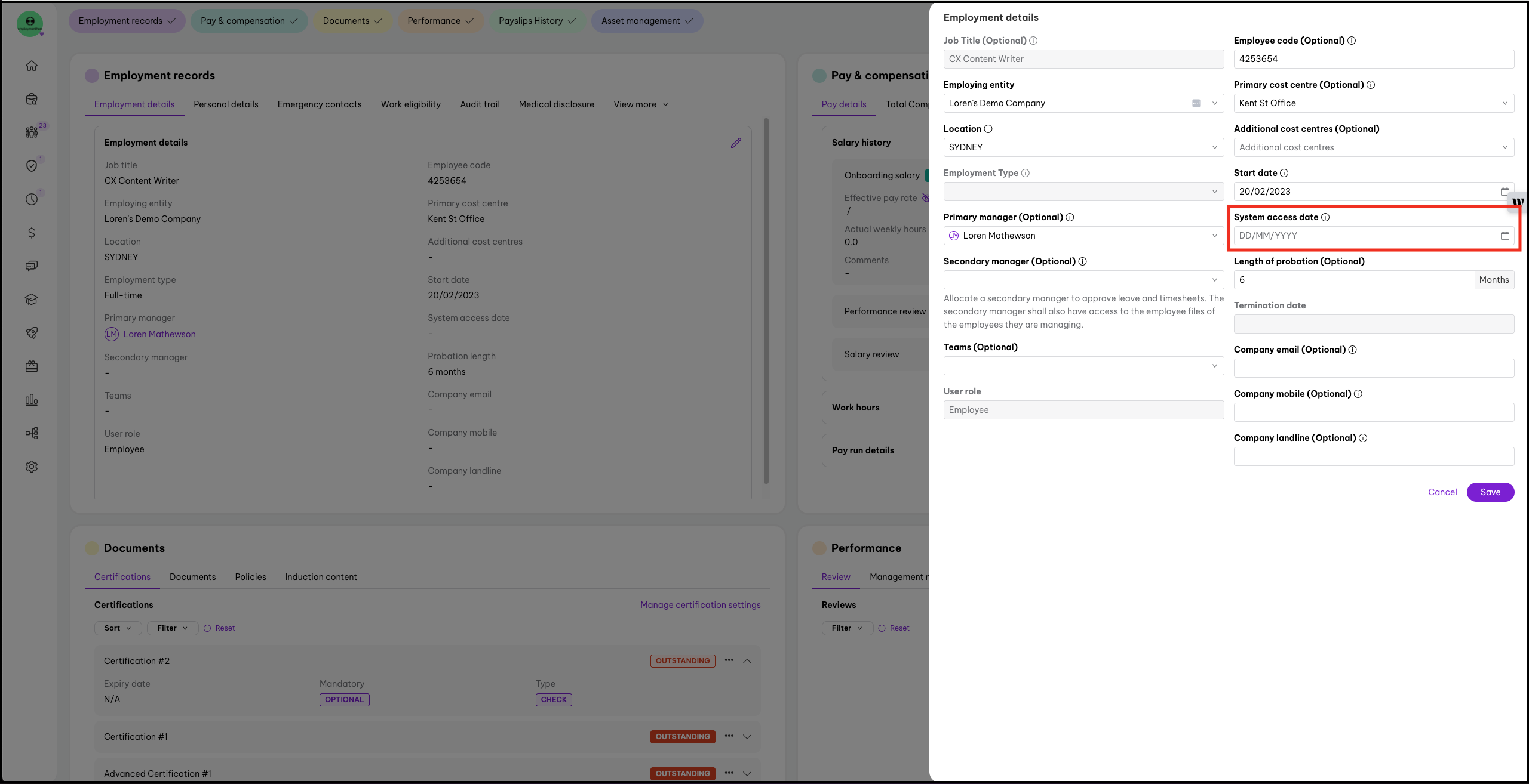 In the employee file, admin users must set a system access date for onboarding employees. This date (on or before the employee’s official start date) determines when they gain full access to Employment Hero. The system access date is a mandatory field.