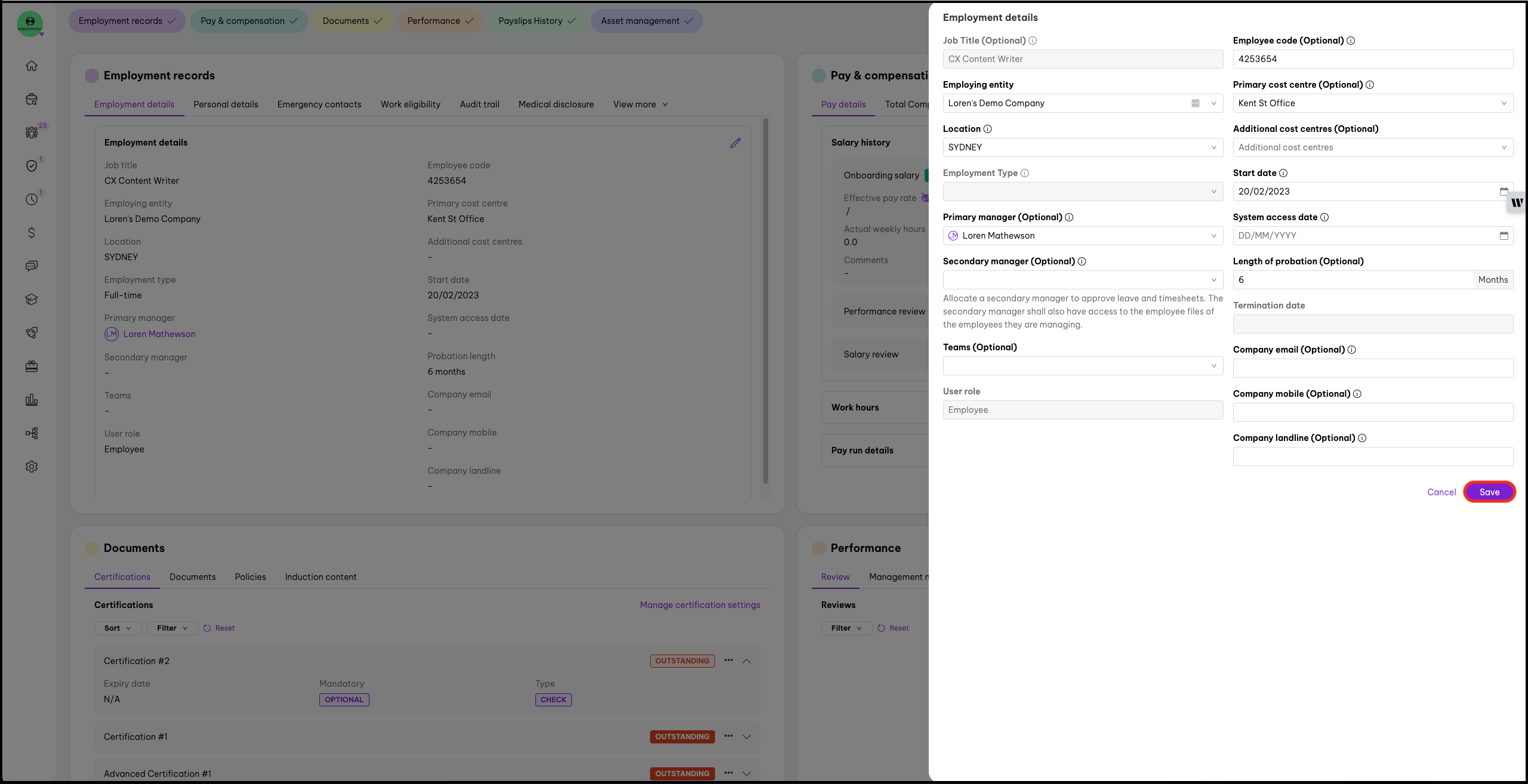 - (for payroll classic users) Synchronise With Payroll - You can sync this employee's data to your chosen payroll platform if it is integrated with Employment Hero.