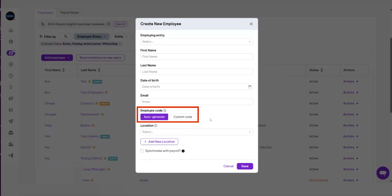 4. Locate the Employee code field with the same radio button options (Auto-generate or Custom code).