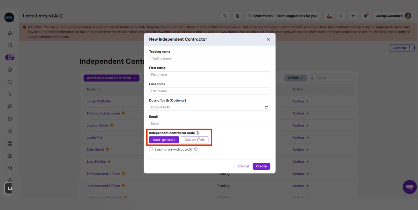 4. Locate the Independent contractor code field with the radio button options (Auto-generate or Custom code).