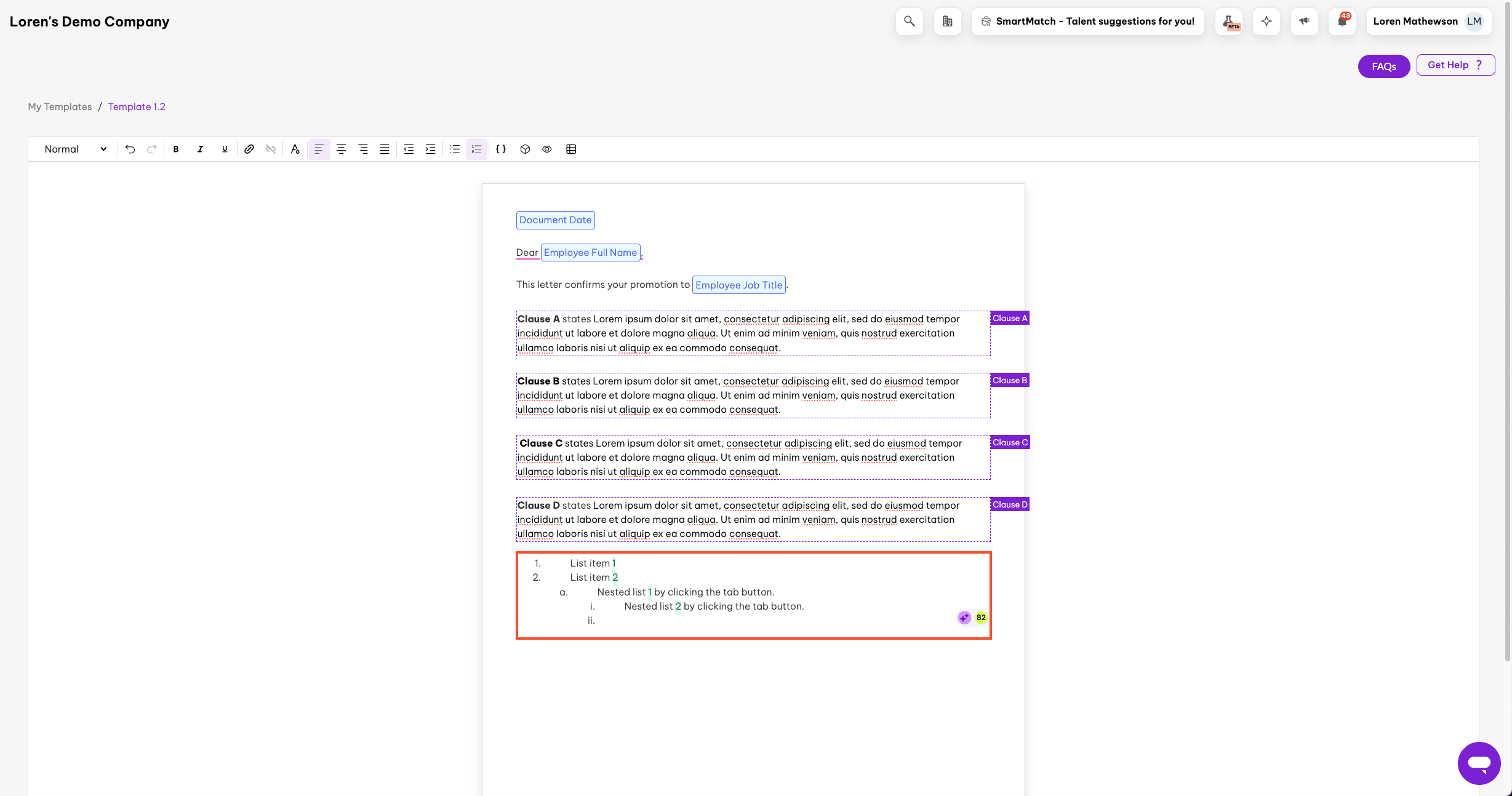 In a template editor, you drop these placeholders into your document so the platform can automatically fill them with the right details later. This lets you create one template and have it personalised for each person without rewriting anything.