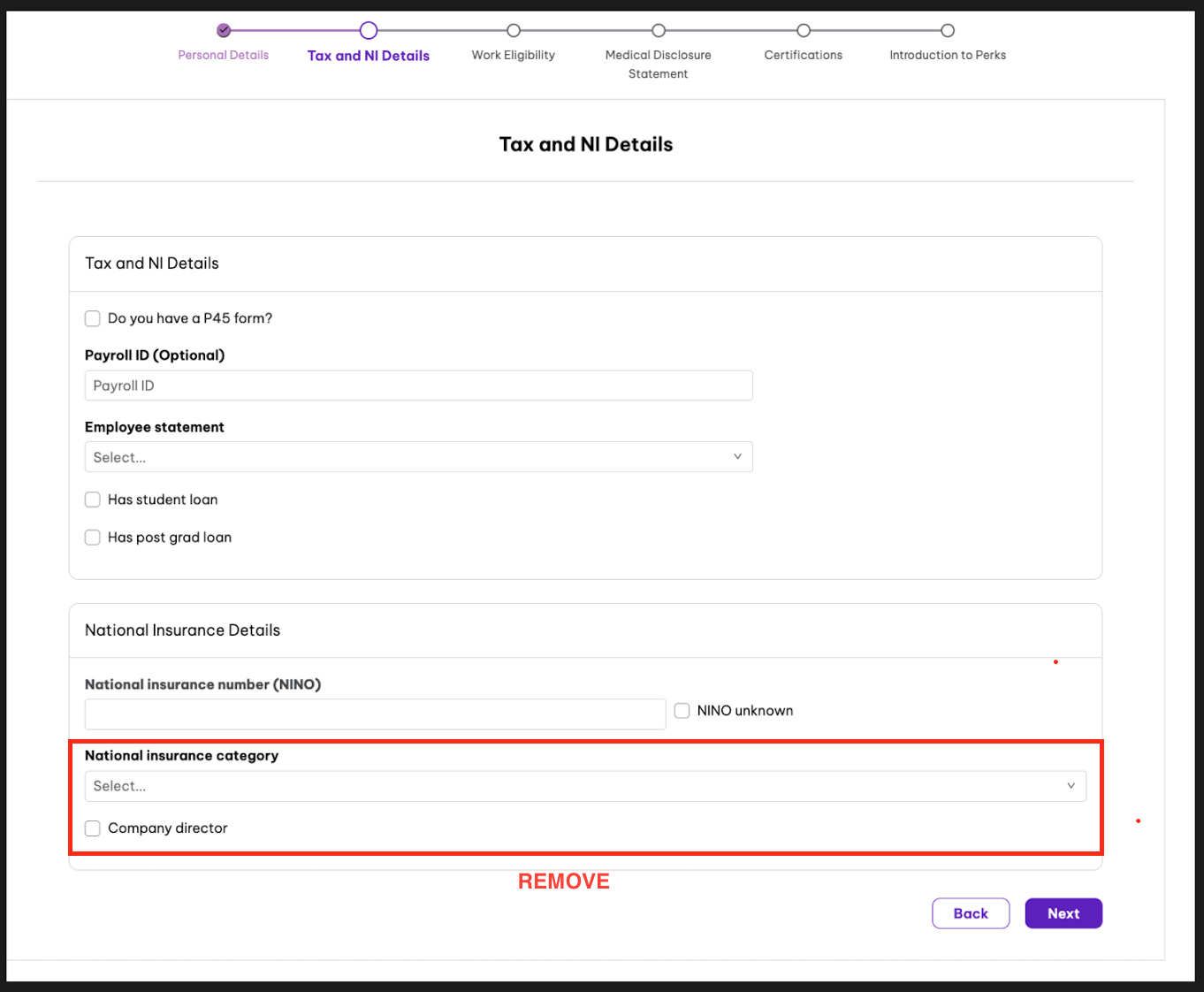 During your self-onboarding, you will provide or verify your National Insurance (NI) number. You do not need to worry about selecting a tax category or company director status, as your employer now manages those classifications to ensure your payroll is compliant with HMRC regulations.