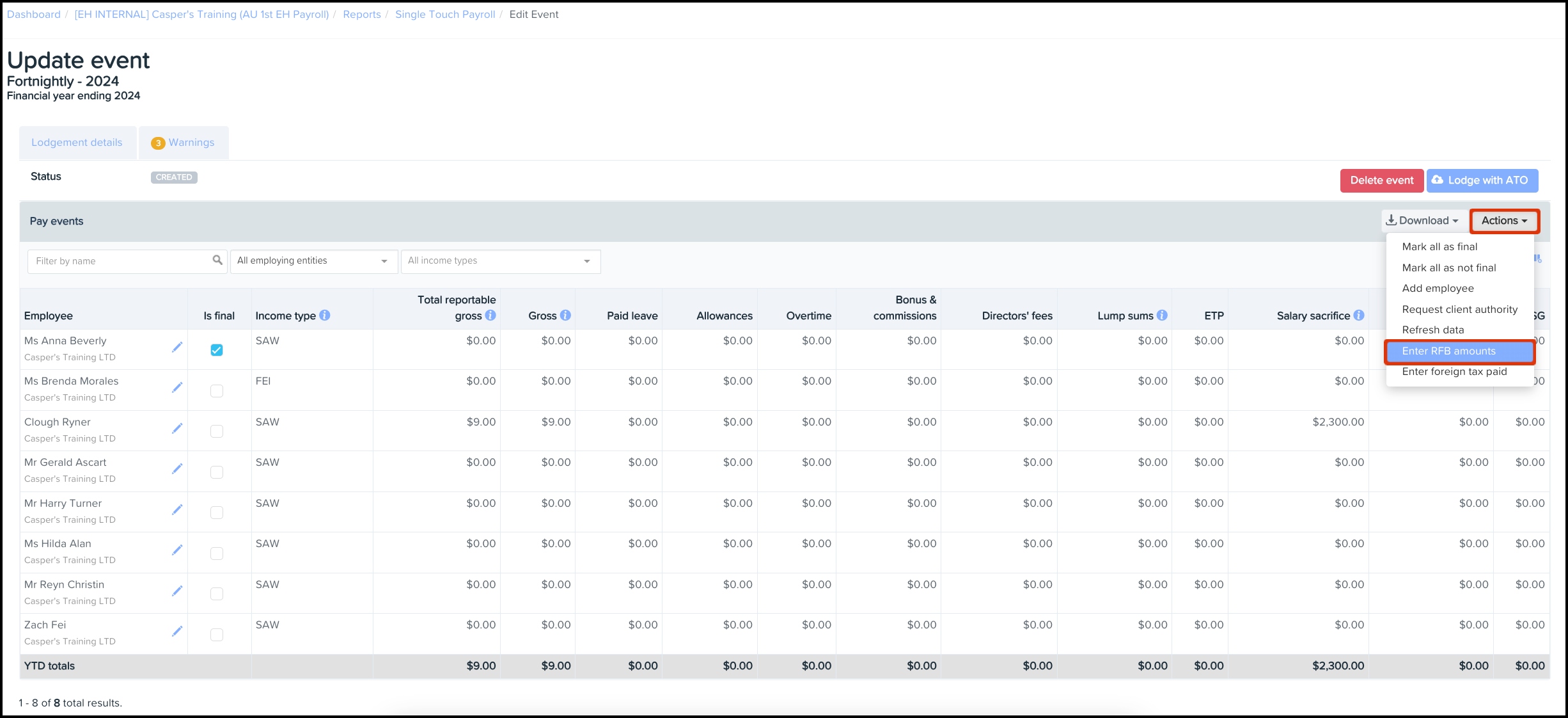 then select 'Actions' > 'Enter RFB amounts' and enter in the year-to-date RFB amounts for each employee, then select the 'Save' button when finished.