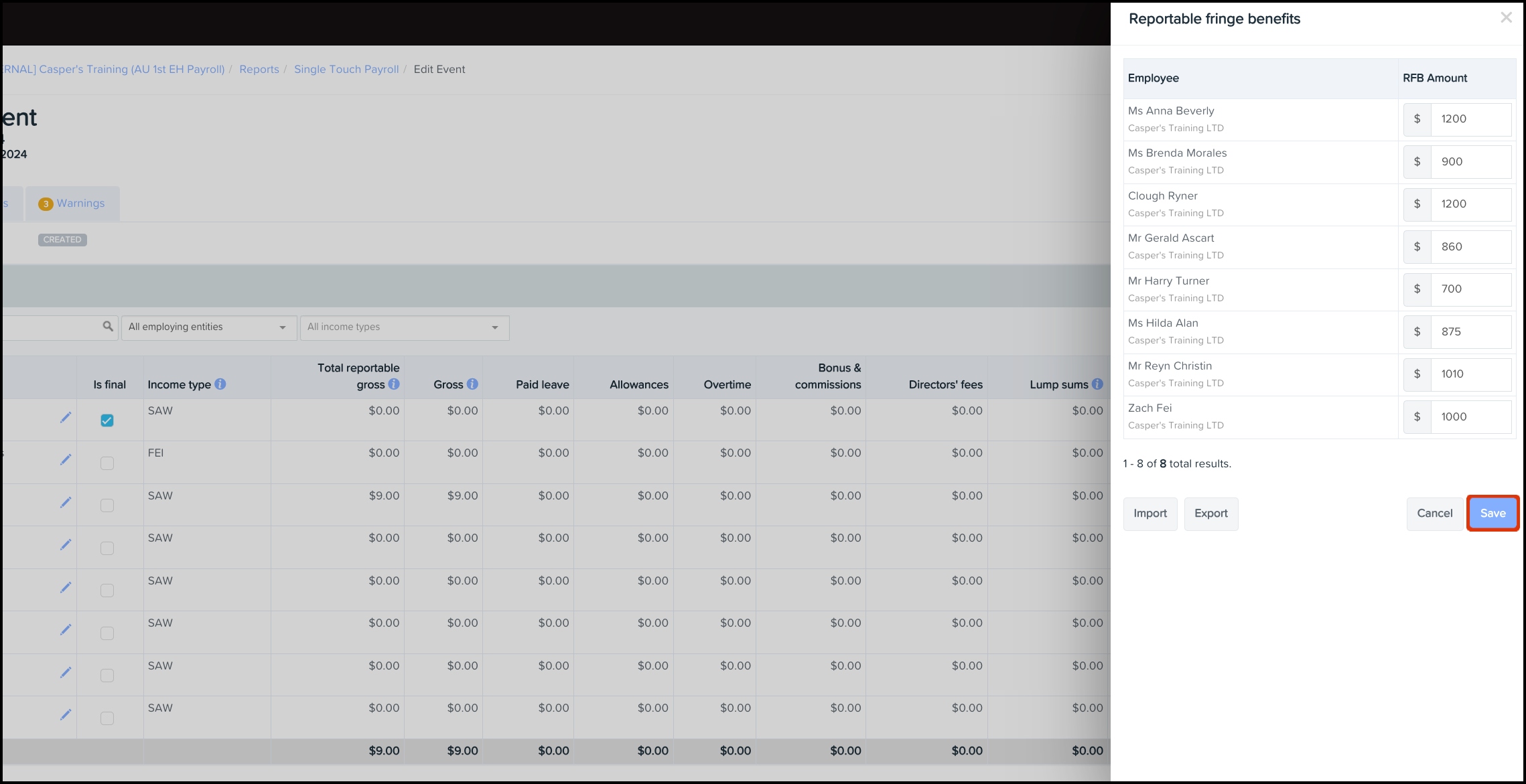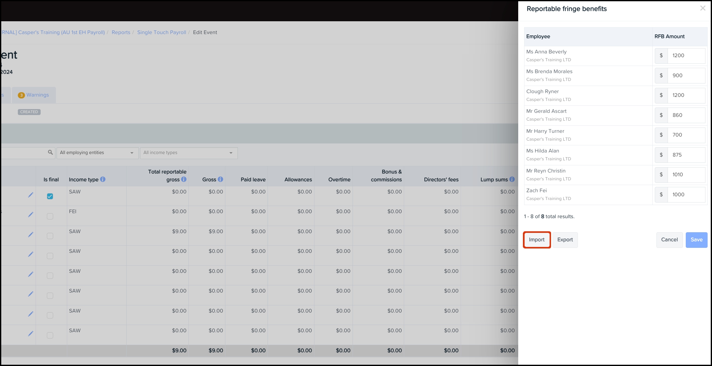 If you have tried to import amounts for employees that were not included in the pay event, you will receive a warning stating that you did not include these employees in this pay event. If you still need to import fringe benefits amounts for these employees, you will need to do so via an amended finalisation event.