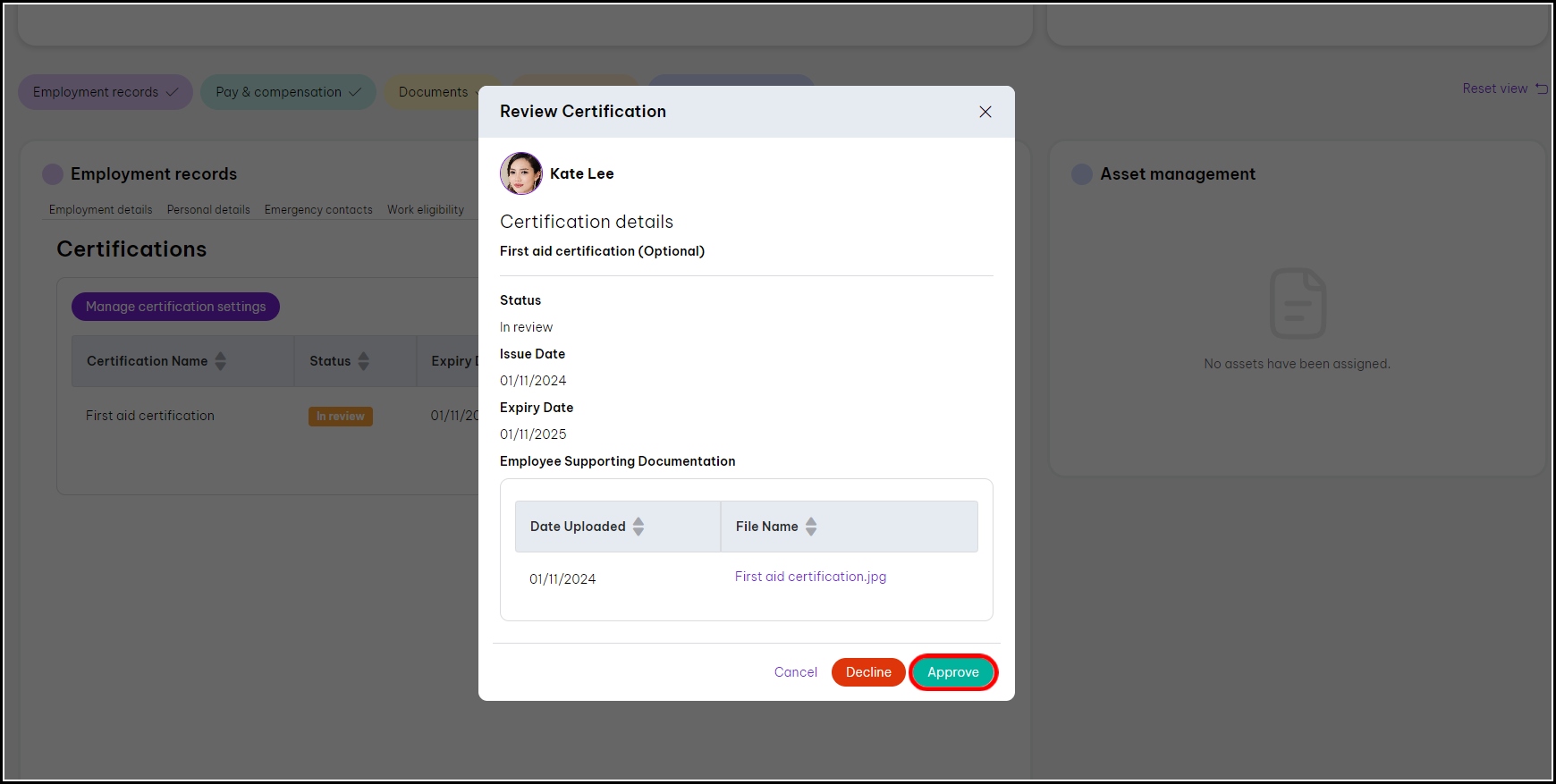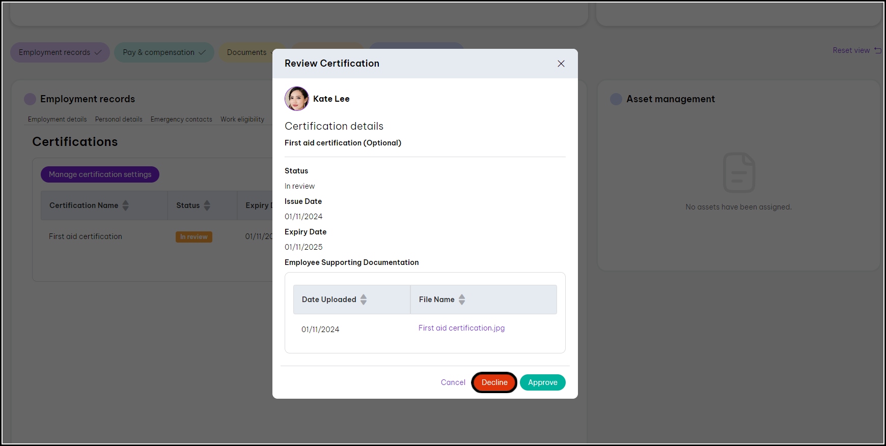 - In review: Employee has completed the certification. However, it requires a primary or secondary manager to approve or decline it.