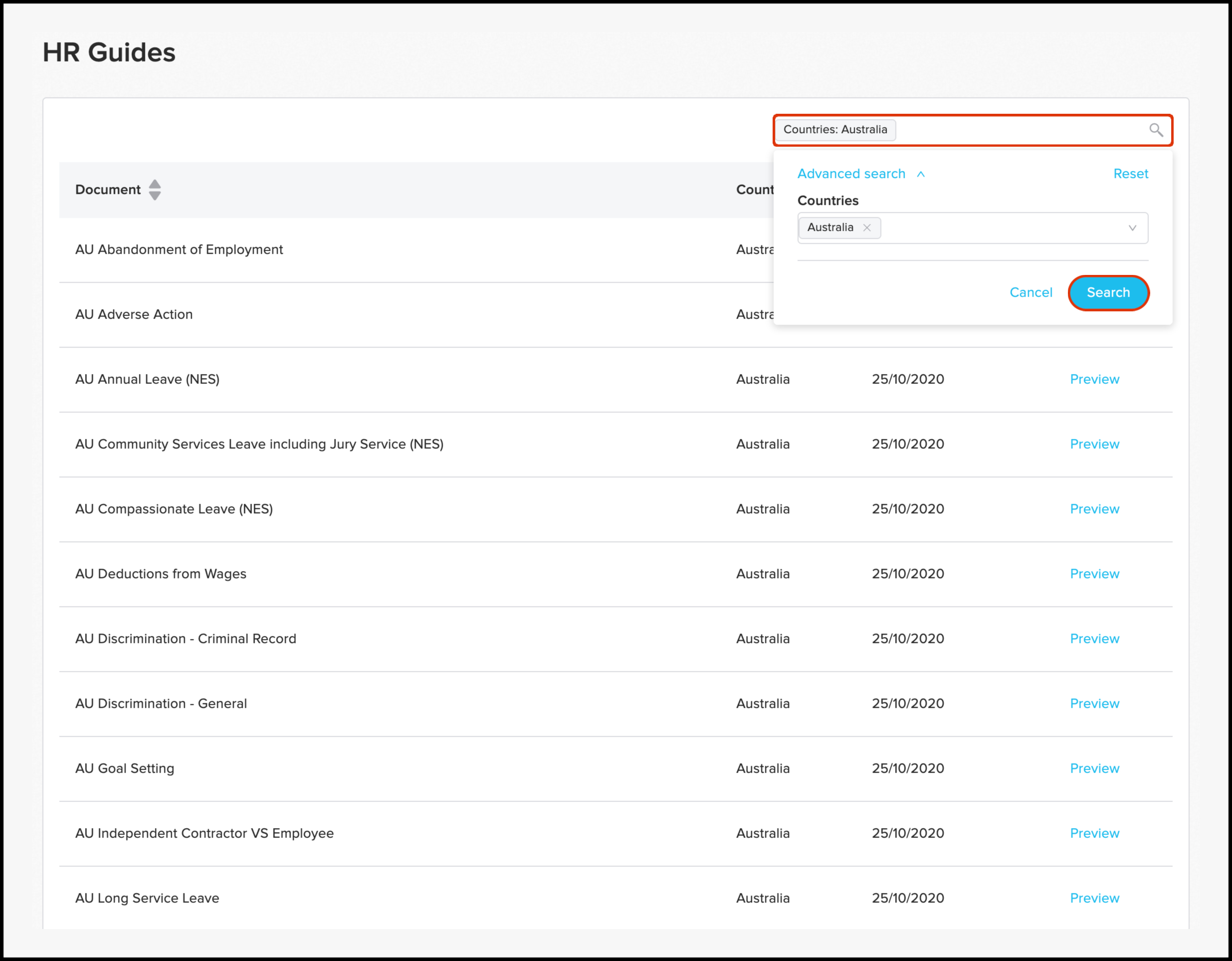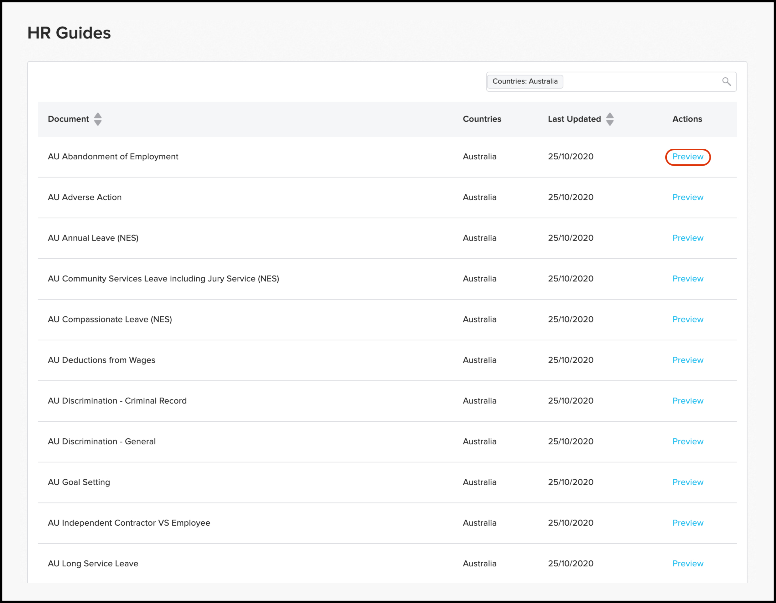 You can use the HR Guides feature to preview a selected document, so you can read the contents on your screen. You can also use this feature to print out a copy of a guide if you need an offline version and filter what information you see on your screen.